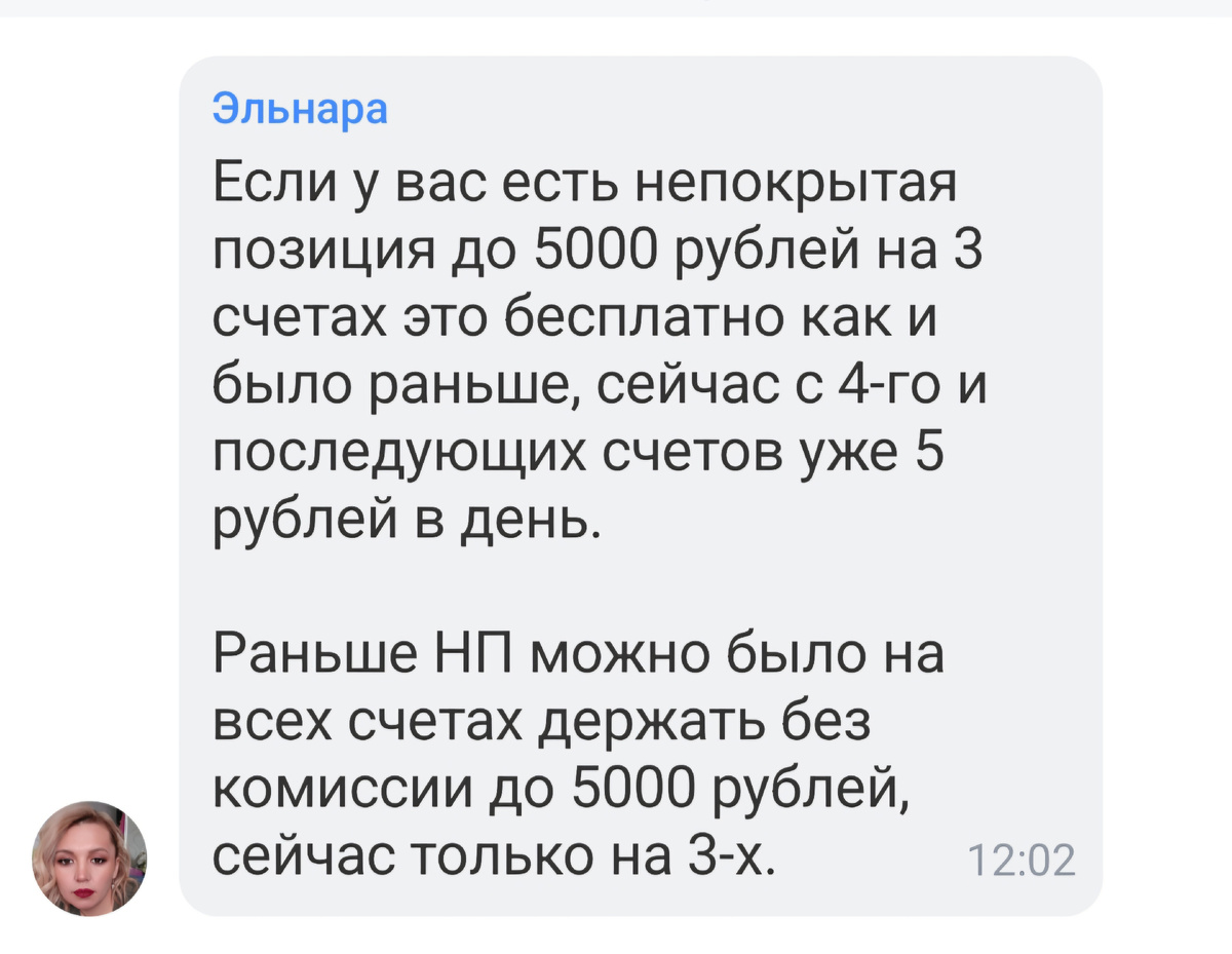 С 4 декабря Т-Брокер вводит комиссию 5 ₽ в день за каждый счет, начиная с четвертого, если на нем есть непокрытая позиция до 5000 ₽ Если у вас, например, 10 брокерских счетов с использованием бесплатной маржиналки, то ежедневная комиссия составит 5₽ × (10 - 3) = 35₽ в день · В расчет берутся все счета, включая ИИС. · Первые три счета не облагаются комиссией. Придётся сокращать количество счетов до 3-х