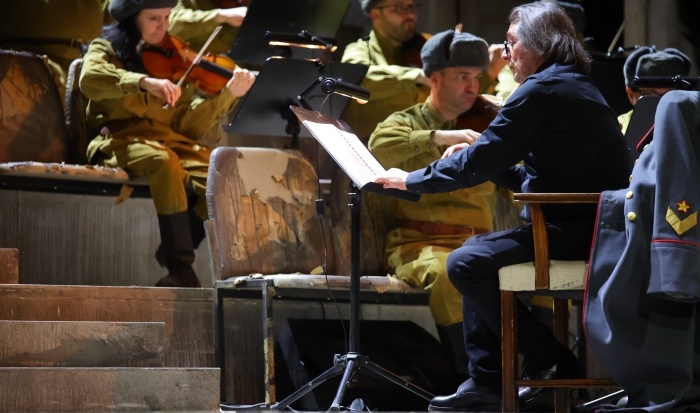 Музыканты камерного ансамбля «Солисты Москвы» (скрипки, альты, виолончели) сидели за нотными пультами в защитных гимнастерках и в шапках-ушанках, в духе эпохи. Даже маэстро Юрий Башмет сперва вышел на сцену в шинели (кажется, генеральской), но, правда, быстро ее снял – так было сподручней дирижировать.