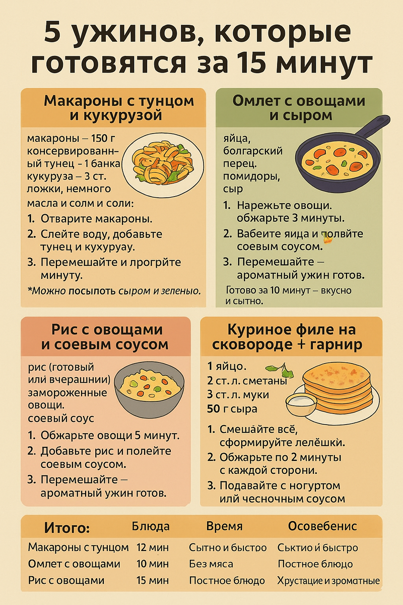 Хорошая новость: вкусный ужин можно приготовить всего за 15 минут — без спешки и лишних ингредиентов. Ингредиенты: Как готовить: