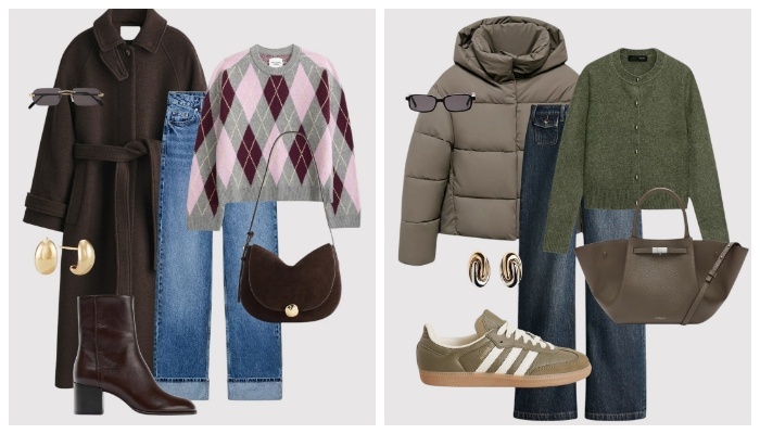 Зима — идеальное время для многослойности, игры с фактурами и трендовыми сочетаниями. Представленные сеты демонстрируют, как можно создавать стильные, уютные и продуманные образы, сохраняя баланс между модой и практичностью. В основе каждого — универсальные джинсы, базовые свитеры, актуальные пуховики и пальто, дополненные выразительными аксессуарами. Универсальные образы с пальто: классика с характером Темно-коричневое пальто в сочетании с джинсами и свитером в аргайл-принте добавляет нотку ретро-романтики. Этот образ выглядит особенно уютно и женственно благодаря мягким линиям и тёплому сочетанию серо-розово-бордовой палитры. Песочное пальто и шоколадный свитер с высоким воротом — пример спокойной, благородной базы. Высокие ботинки и сумка в тон делают образ цельным, а золотые украшения добавляют утончённости. Укороченная куртка из шерсти и бордовая полосатая рубашка создают динамичный образ, в котором геометрия и минимализм встречаются с насыщенным цветом. Гладкие кожаные ботинки и