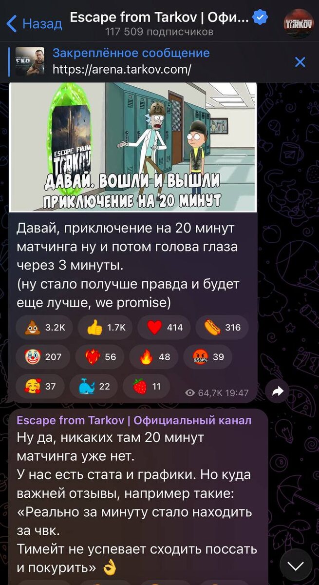 Не хочу брать в С.В.И.Н.а, но не могу не поделиться со свидетялеми вчерашнего стрима Базара зиро - поиск за 5 минуток, ток дропы такие, что играть невозможно, есши вообще сервак не крашится Но это, как говорится, детали Можно попробовать скинуть на упавший клаудфайр, но хзхз Вообще, мне это начинает напоминать тактику йоты из нулевых, когда они вместо увеличения мощностей 3g интернета просто начали повышать цену, чтоб лишние сами отвалились Никит, я правда хочу в Тарков побегать, дай поиграть 😭 P.s. справедливости ради под вторым постом 3.5к сердечек, оно в скрин не влезло просто, но, видимо, это я лох у которого так работает
