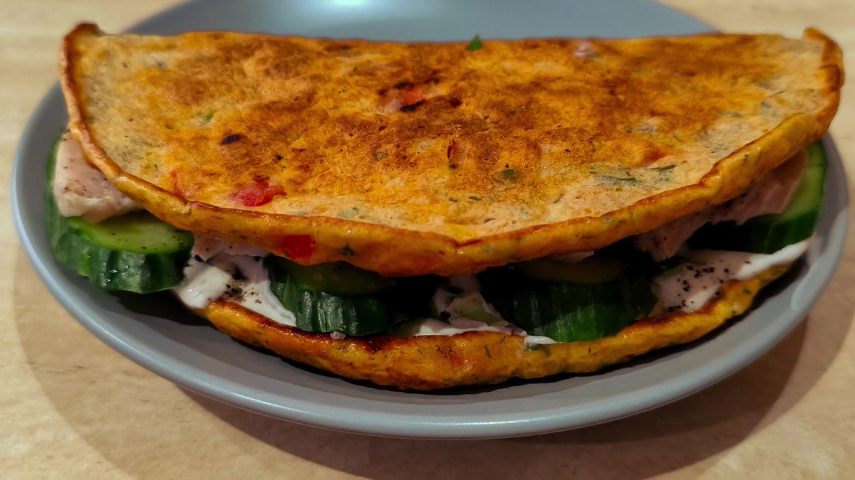 Всем привет! У меня для вас ещё один рецепт вкусного и сытного завтрака. Как всегда из доступных продуктов и простой в приготовлении. Что понадобится для приготовления: ЦЕЛЬНОЗЕРНОВАЯ ПЫШКА С НАЧИНКОЙ: яйца 2 шт 100 г -156 ккал мука цельнозерновая пшеничная 35 г -107 ккал кефир 2,5 % 50 г -28 ккал лук зелёный 3 г -1 ккал помидоры 60 г -12 ккал сметана 15 % 25 г -40 ккал куриная грудка отварная 60 г -82 ккал огурцы свежие 60 г -9 ккал масло растительное 2 г -18 ккал петрушка 3 г -1 ккал соль по вкусу -0 ккал ВЫХОД ГОТОВОГО ЗАВТРАКА 398 ГРАММОВ. ЭНЕРГЕТИЧЕСКАЯ ЦЕННОСТЬ ВСЕГО ЗАВТРАКА 454 ККАЛ НА 100 ГРАММОВ: ККАЛ -114 БЕЛКИ -8,5 ЖИРЫ -5,1 УГЛЕВОДЫ -7,3 ПРИГОТОВЛЕНИЕ: 1. Помидоры и зелень мелко нарезаю. 2. В глубокой чашке смешиваю яйца, помидоры, зелень, муку пшеничную цельнозерновую, кефир. Солю по вкусу и перемешиваю. 3. Сковороду смазываю двумя каплями растительного масла и слегка разогреваю. 4. Подготовленную массу выкладываю в сковороду и готовлю примерно 7 минут под крышкой, чтобы