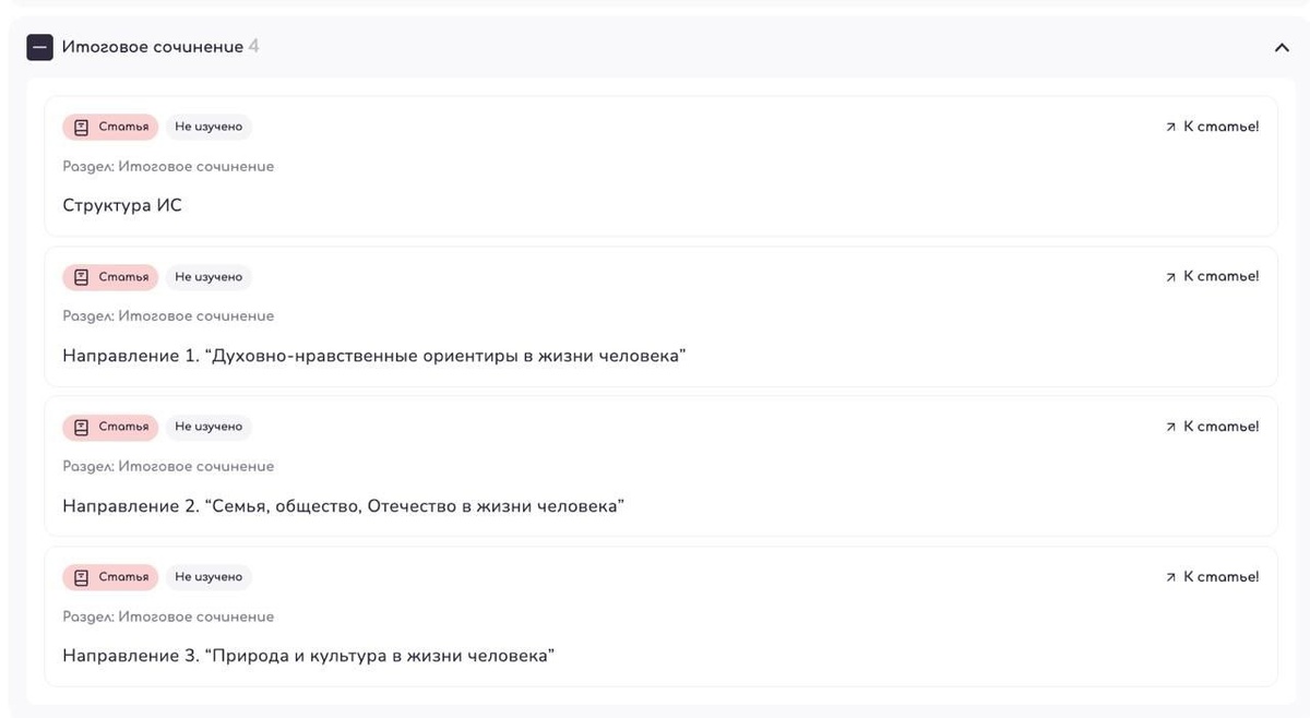 +4 статьи об Итоговом сочинении в Умном справочнике! Умный справочник — это наш открытый ресурс. Там можно найти краткую теорию по любому разделу ЕГЭ. А теперь ещё и по Итоговому! Вы можете бесплатно почитать про: - структуру сочинения - направление 1: духовно-нравственные ориентиры - направление 2: семья, общество, отечество - направление 3: природа и культура В статьях по направлениям есть небольшие списки для чтения 🫶 Если ваша цель — не просто понять теорию, а научиться писать идеальные сочинения на 5/5, залетайте на курс по Итоговому 🎉 Сегодня в 19:00 МСК мы детально разберём одно из направлений и напишем 2 сочинения прямо вебе!