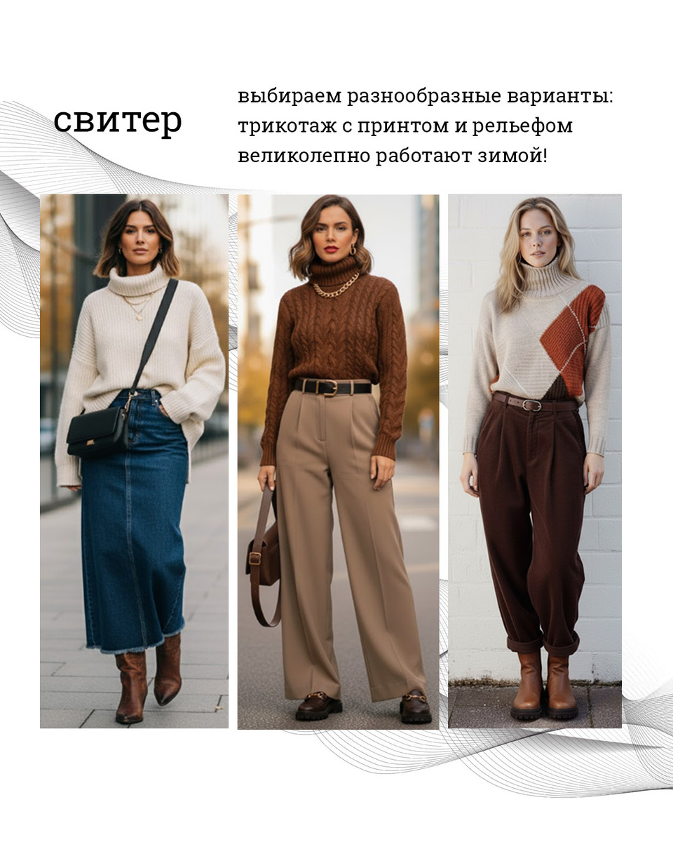 Давайте честно: сколько из нас с наступлением холодов переходят в режим "свитер + джинсы" и превращаются в нечто невыразительное, что годится только для смены вещей в гигиенических целях? 🙋🙋🙋 Все же хотят выглядеть стильно, а стиль - это характер образа! А какой характер у невзрачности и банальности? Да никакого! Скукота💯 «Но ведь это же база!» – скажете вы. И я скажу: "База бывает разная!" Базовый свитер и базовые джинсы — это, конечно, практично. Но, гардероб превращается в дежурный, так, чтобы было что-нибудь надеть Выходим из "базовой комы": ваш трикотаж должен быть разным!💃 Разнообразие — ключ к смыслу. Забудьте про одну-единственную, плотно облегающую водолазку. Нам нужны разные категории: Поло, свитер, джемпер, кардиган, свитшот, пуловер. И каждый из них должен иметь свой характер за счет: 👉Фактуры: от гладкого мериноса до объемной букле или косички. 👉Цвета и принта: цветные блоки, полоски, абстракция. Прекратите покупать 50 оттенков бежевого - это по крайней мере,