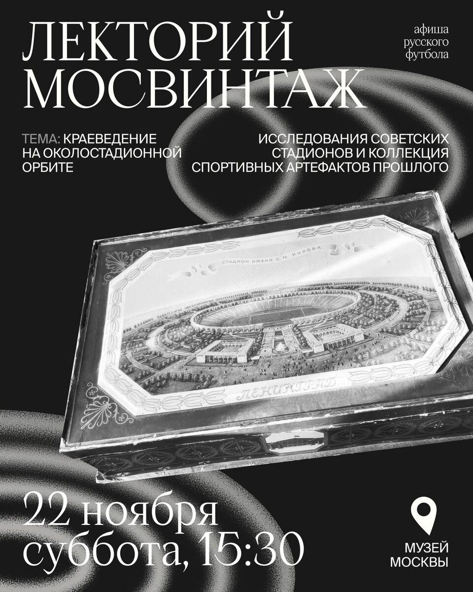 Афиша русского футбола приглашает москвичей и гостей столицы изучать историю через призму спортивной архитектуры и монументального искусства На площадке лектория Мосвинтаж личную клллекцию артефактов и наблюдений представит культуролог Иван Блинов — автор обожаемого редакцией краеведческого блога Sub Specie Ludi Места на погружение в мир футбола середины прошлого века можно занять на сайте площадки