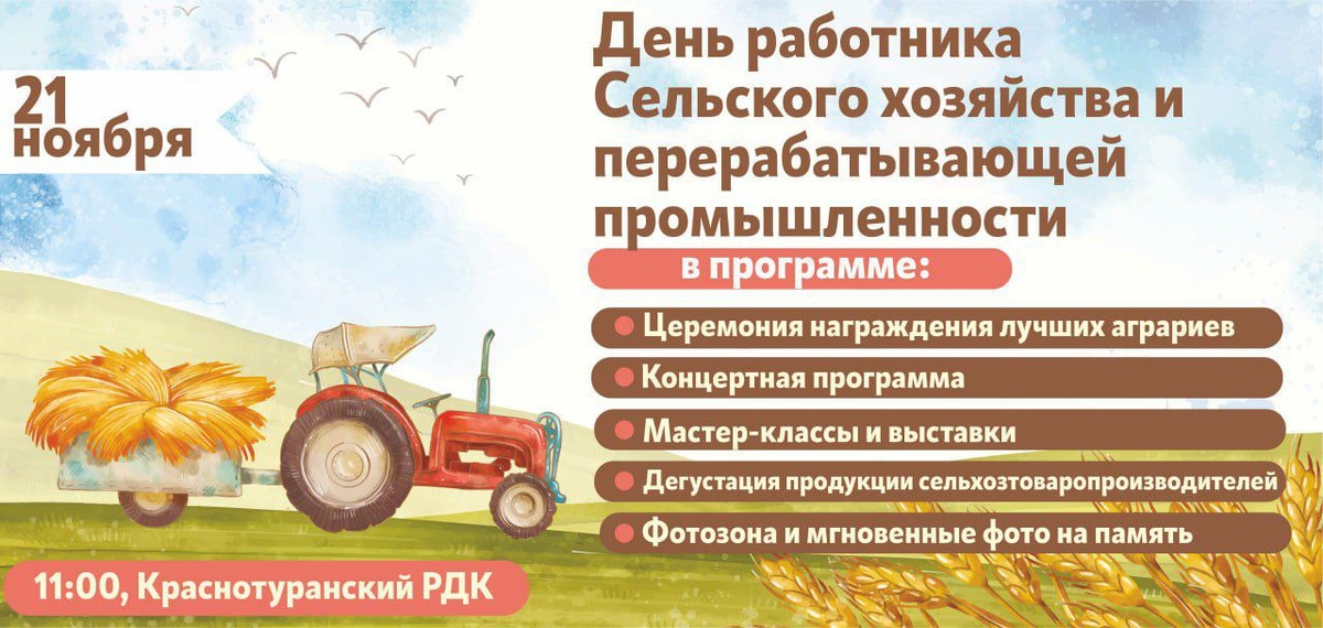 🔔ВСЕМ! ВСЕМ! ВСЕМ! ‼️ УЖЕ ЗАВТРА, 21 ноября ⏲️В 11:00 в Краснотуранском РДК состоится праздник ко Дню работника Сельского хозяйства и перерабатывающей промышленности. 🏆В ПРОГРАММЕ: Церемония награждения лучших аграриев (расскажем по секрету, что их будет 44 человека!) 🦓Мастер класс по подковыванию лошади на макете 🎆 Фотозона, на которой вы получите моментальные фото 👨🍳Праздник вкуса на дегустации продукции АО "Племзавод "Краснотуранский" , АО "Тубинск" Выставки библиотеки и музея и различные мастер - классы. 💃🕺И, конечно же праздничный концерт! ⚠️ ВСЕ ЭТО СОВЕРШЕННО БЕСПЛАТНО! ✨Не упустите шанс увидеть всё своими глазами! #ЭхоТурана #Новости #Читаем #Подписываемся #Краснотуранск 🌐 Сайт | 📱 Тelegram | 📱 ВК | 📱 ОК |💙RUTUBE |📱 ДЗЕН