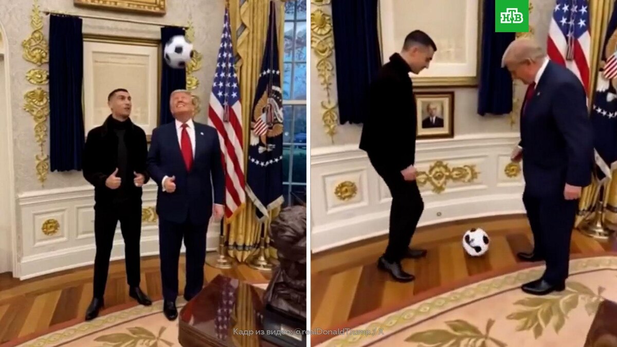 [ Смотреть видео на сайте НТВ ] Знаменитый португальский футболист Криштиану Роналду побывал в Белом доме в рамках визита в США наследного принца Саудовской Аравии Мухаммеда бен Салмана. Дональд Трамп по итогам встречи с Роналду в Белом доме опубликовал в своей соцсети Truth Social сгенерированное нейросетью видео, на котором ловко играет с португальцем в футбол прямо в Овальном кабинете. «Роналду — крутой парень. Я доволен встречей с ним в Белом доме. Действительно умный и крутой», — подписал видеоролик президент США. Роналду, выступающий за саудовский футбольный клуб «Аль-Наср», 19 ноября посетил Белый дом вместе со своей невестой Джорджиной Родригес в рамках визита в США наследного принца Саудовской Аравии Мухаммеда бен Салмана. Перед ужином Трамп назвал Роналду величайшим футболистом, отметив, что для него большая честь принять его в Белом доме. [ Смотреть видео на сайте НТВ ]