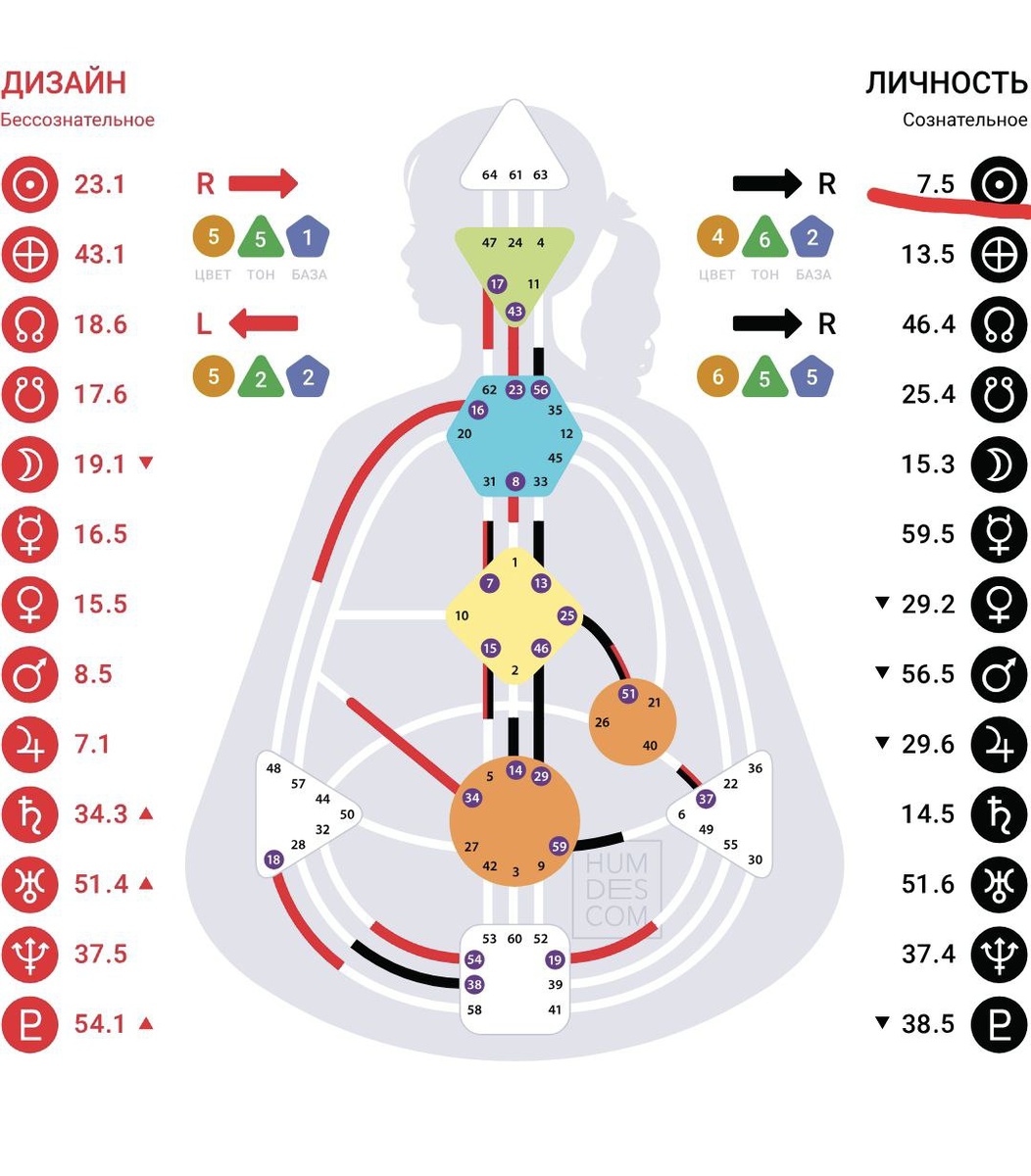 В системе Дизайна человека есть такое понятие, как БОДИГРАФ. И именно бодиграф вы видите на этом изображении. Бодиграф отражает уникальную энергетическую, личностную структуру каждого из нас. И о каждом из нас может многое рассказать. Чтобы построить свой бодиграф нужно перейти на сайт https://www.humdes.com/ru, ввести свои данные для расчета. Это ваше место, дата и время рождения. И в итоге вы увидите похожую картинку, но она точно будет отличаться у каждого человека. В бодиграфе каждого человека есть очень важная цифра, которая называется Солнце личности. Наше Солнце личности указывает на наше дело жизни. На изображении я подчеркнула эту цифру красной чертой. И я хочу в ближайшее время расшифровывать вам о чем именно говорит каждая цифра. Я думаю, это будет интересно каждому. Узнать больше о себе, своих детях и близких ❤️