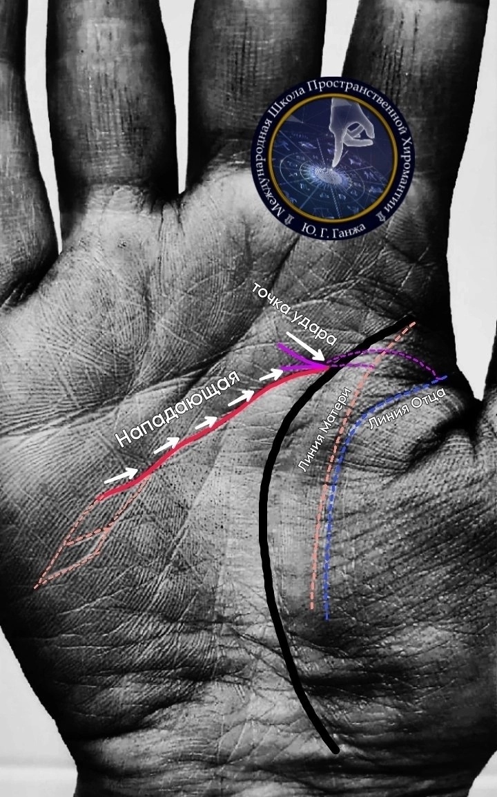 🚩Линия Головы, практический пример нападающей.🚩 Линия Головы отображает психическое состояние человека. Например, люди с ломаной и сложной линией Головы являются достаточно не стандартными по своему поведению и психика их не устойчива, они сильно реагируют на внутренние и внешние обстоятельства, которые воздействуют на неё. Бывают случаи отображения резкого шока, когда линия Головы имеет вид нападающей, а потом человек живет уже с такой линией, которая по сути является агрессором. На данном примере линия Головы в виде нападающей с Урана (Марса+), но помимо этого, в эту же больную точку направлен острый угол, который добавляет силы агрессии происходящего события. А событие это связками тянется к линиям Матери и Отца, унося их одновременно из этой жизни. Произошло смертельное ДТП. А у обладателя руки, это событие, психологически, сказалось на всей жизни. #мшпх #линияГоловы #практика #МиланаИннова От Миланы Инновой