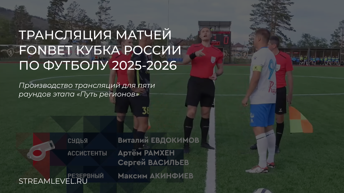 С августа по октябрь 2025 проходил этап FONBET Кубка России по футболу — «Путь регионов». Всего 6 раундов, в 5 из которых нам удалось организовать трансляции для заказчиков, которые в конечном итоге транслировались на «Матч ТВ» или «Матч Премьер», в ресурсы спортивного интернет-портала Sportbox и в приложение FONBET. За 3 месяца работы нам удалось произвести трансляции 53 матчей FONBET Кубка России по футболу в 36 городах по всей России, включая Сибирь и Дальний Восток. 1 — Основная камера 14-22х (центральная трибуна, общий план поля используется для большинства ситуаций в матче, строго по центру поля)