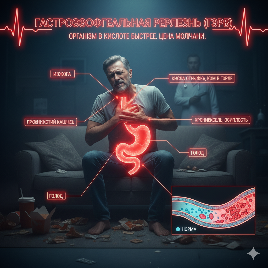 Антон, 30 лет, начал регулярно испытывать сильную изжогу (жжение за грудиной), особенно после обильной еды, наклонов и ночью. Он часто просыпался от кислой отрыжки и чувствовал ком в горле. Антон убеждал себя, что это просто последствия "переедания", "любви к кофе" или "острым блюдам". Он постоянно пил соду или антациды, которые давали быстрое, но кратковременное облегчение, и избегал визита к гастроэнтерологу.