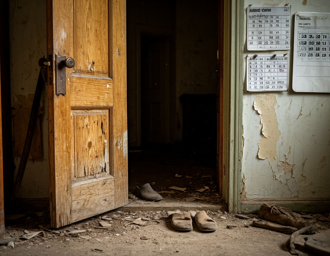 И тогда всё началось. Дверь выбивали ломом. Дерево было сухое, крошилось от прикосновения. И вот, когда лом с треском сорвал остатки замка, дверь распахнулась — и люди застыли. В комнате был… 1975 год. Не по ощущениям — по факту. Тапочки у двери — изношенные, с подмятыми пятками. Календарь на стене — март 1975, с оторванными прошлыми датами.