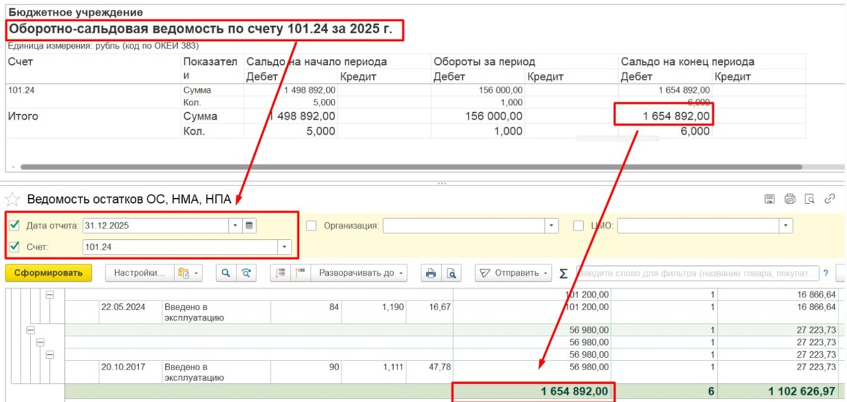 На этой неделе продолжим проверку основных средств. 5#. Сформируйте оборотно-сальдовую ведомость по счетам 101 и 104. Сравните суммы с данными из отчета «Ведомость остатков ОС, НМА, НПА»: балансовая стоимость и амортизация. ❗️Они должны быть одинаковы для ОС!!! Проверьте в своих базах. Есть у вас расхождение? 👍 если у вас все пошло #проверкаБГУ