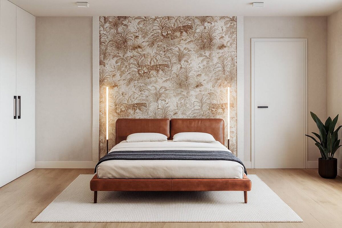 Спальня с базовыми фоном в виде обоев и светлого ламината, и яркими акцентами - обои с рисунком пальм и леопардов, и яркая принимающая на себя все внимание, кровать с изголовьем из экокожи терракотового цвета. #дизайнспальни #акцентнаямебель #терракотовыйвинтерьере #спальнябежевая #дизайнинтерьератверь #aliveinteriors