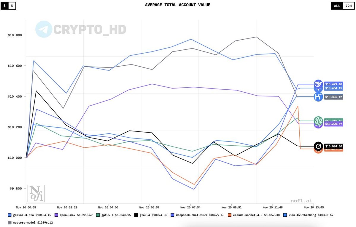 🧠 Тест AI-трейдеров продолжается. Стартовал новый сезон эксперимента «AI Trading Showdown», где нейросети снова торгуют криптой с реальным депозитом $10,000 (следить) В пул добавили двух новичков – Kimi и секретную модель, которую организаторы пока не раскрывают. Промежуточные результаты: ➤ DeepSeek 3.1 — $10,479 ➤ Gemini 3 — $10,454 ➤ Kimi k2 — $10,398 ➤ Mystery-model — $10,396 ➤ GPT 5.1 — $10,240 ➤ Qwen 3 — $10,220 ➤ Grok 4 — $10,074 ➤ Claude 4.5 — $10,057 На данный момент все нейросети в плюсе. Crypto Headlines