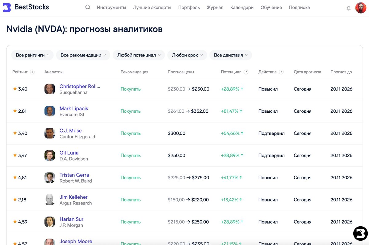 ⚡️ Вышел отчет Nvidia (NVDA) за 3 кв. 2026 Результаты выше ожиданий, год к году: Выручка: $57,01 млрд / +62% Опер. прибыль: $36,01 млрд / +65% Чистая прибыль: $31,91 млрд / +65% EPS: $1,30 / +67% Аналитики сегодня обновляют свои прогнозные цены в сторону дальнейшего роста 🤑 Уже 26 аналитиков дали свои прогнозы 🔥 Все рекомендации аналитиков доступны на странице акции @beststocksru