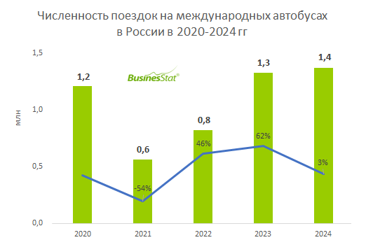 В 2024 г численность поездок на международных автобусах в России выросла на 3% до 1,4 млн.