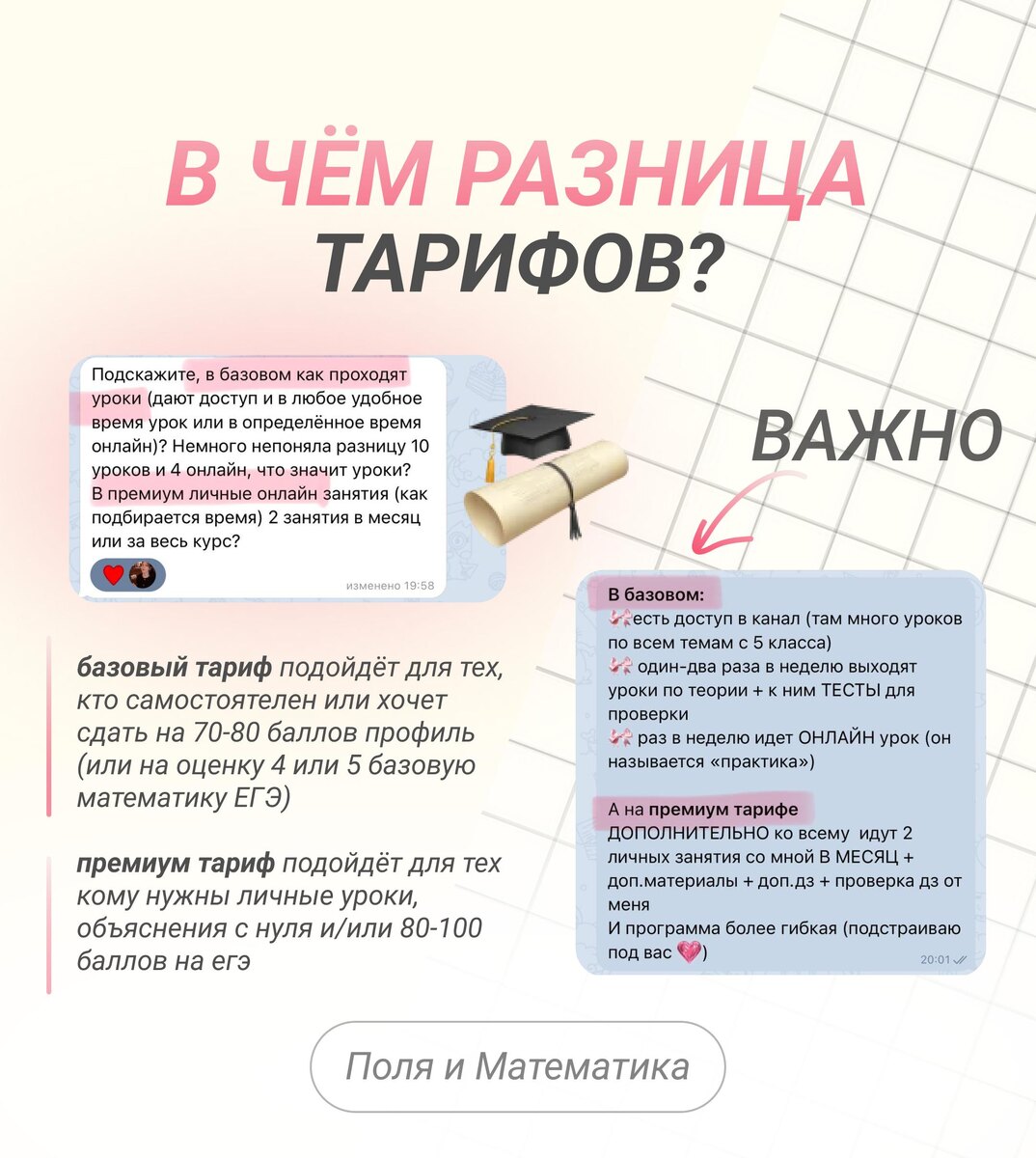 В ЧЕМ РАЗНИЦА: ОСНОВНОЙ vs ЛИЧНЫЙ ТАРИФЫ ❓ отвечаю на самые популярные вопросы :) 🤝🏻 у нас есть годовой курс как для ЕГЭ-2025/26 база, так и для ПРОФИЛЯ ✏️ • на основном тарифе за вами будет закреплен КУРАТОР-ВЫСОКОБАЛЛЬНИК — мест осталось: 46 • на личном тарифе у вас проверять работы буду Я ЛИЧНО — мест осталось: 4 🗓 записывайся на годовой курс ЕГЭ-2026 и начинай готовиться у нас, даже если ты с НУЛЯ 💚 ⚠️пиши «ГОД» (нажми, копируется) в лс @poleinehelp ⚠️