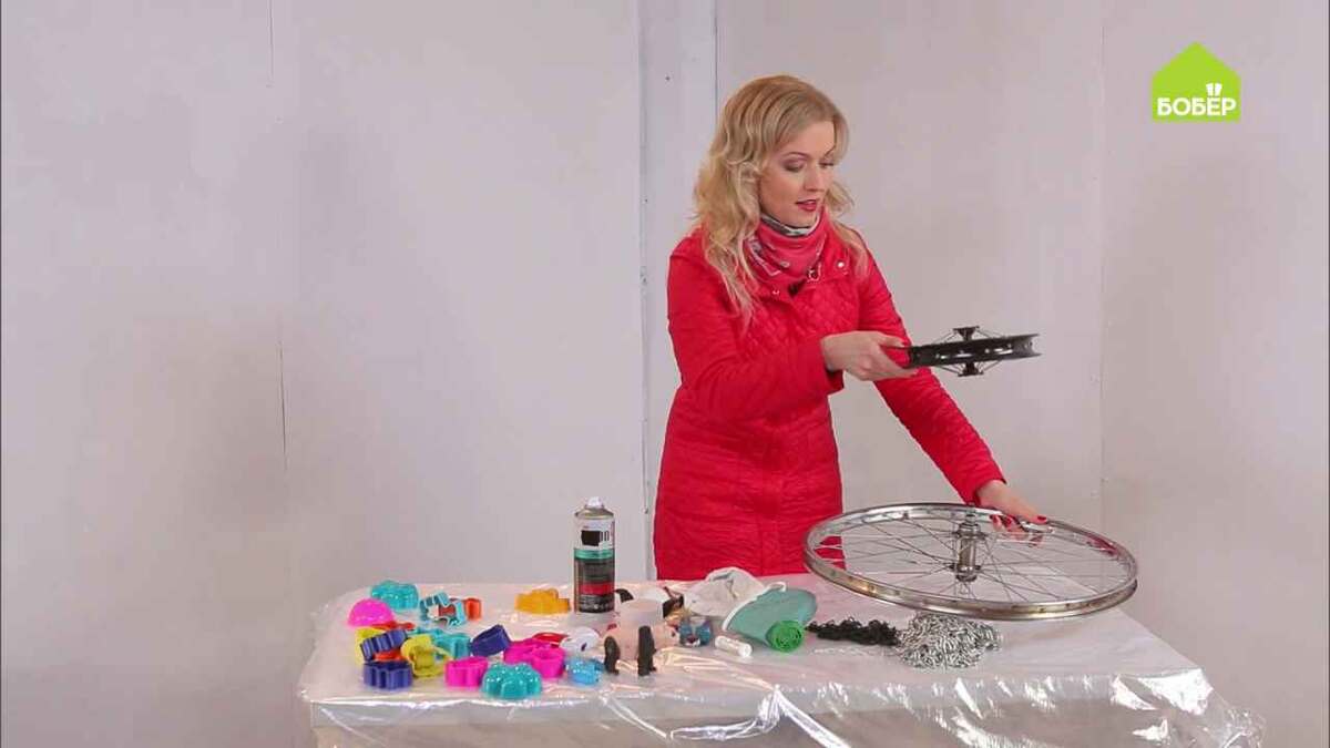 Этот новогодний двухъярусный светильник добавит волшебства и уюта в ваш Новый год. Творите вместе с детьми! Люстра будет двухъярусной: большое колесо станет нижним ярусом, а малое — верхним. Застелите рабочую поверхность полиэтиленовой плёнкой и покрасьте нижний ярус люстры в серебристый цвет, используя краску в баллончике. Не забудьте надеть защиту: перчатки, респиратор и халат. К каждой игрушке прикрепите проволоку. Покрасьте все игрушки в серебряный цвет, используя краску в баллончике. Подготовьте 4 куска цепи, чтобы на конце каждой было по 2 разогнутых звена для соединения между собой ярусов будущей люстры. Проденьте цепь в верхний ярус люстры, зацепите звенья и при помощи плоскогубцев зафиксируйте цепь. Таким же образом прикрепите к верхнему ярусу оставшиеся три цепи, располагая их на равном расстоянии друг от друга, чтобы люстра висела ровно. Оставшиеся концы каждой цепи прикрепите к нижнему ярусу люстры. Возьмите более крепкую цепь и используйте в качестве подвеса: проденьте е