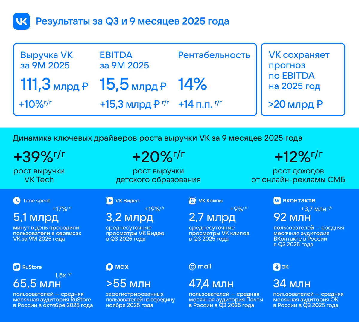 Парафраз бессмертных строк А.С. Пушкина как-то сам сложился после чтения следующих новостей VK стал лидером по аудиторным показателям в интернете: за девять месяцев 2025 года параметр проведённого времени в приложении составил в среднем 5,1 миллиарда минут в день. Это на 17 % больше времени по сравнению с аналогичным периодом 2024 года. Выручка компании за девять месяцев 2025 года увеличилась на 10 % до 111,3 млрд рублей. А сегмент «Технологии для бизнеса», представленный VK Tech, показал подъём выручки на 39 % год к году до 10,7 млрд рублей. Растут и доходы от видеорекламы: они увеличились на 69 % до 3,7 млрд рублей. А денежный оборот образовательных сервисов для детей стал на 20 % больше и составил 5,4 млрд рублей. Выручка сегмента «Социальные платформы и медиаконтент» за девять месяцев 2025 года увеличилась на 6 % до 77 млрд рублей. Увеличению выручки сегмента также способствовал рост времени просмотра VK Видео в 3,2 раза за год. С июля 2025 года сервис занимает первое место по ежем