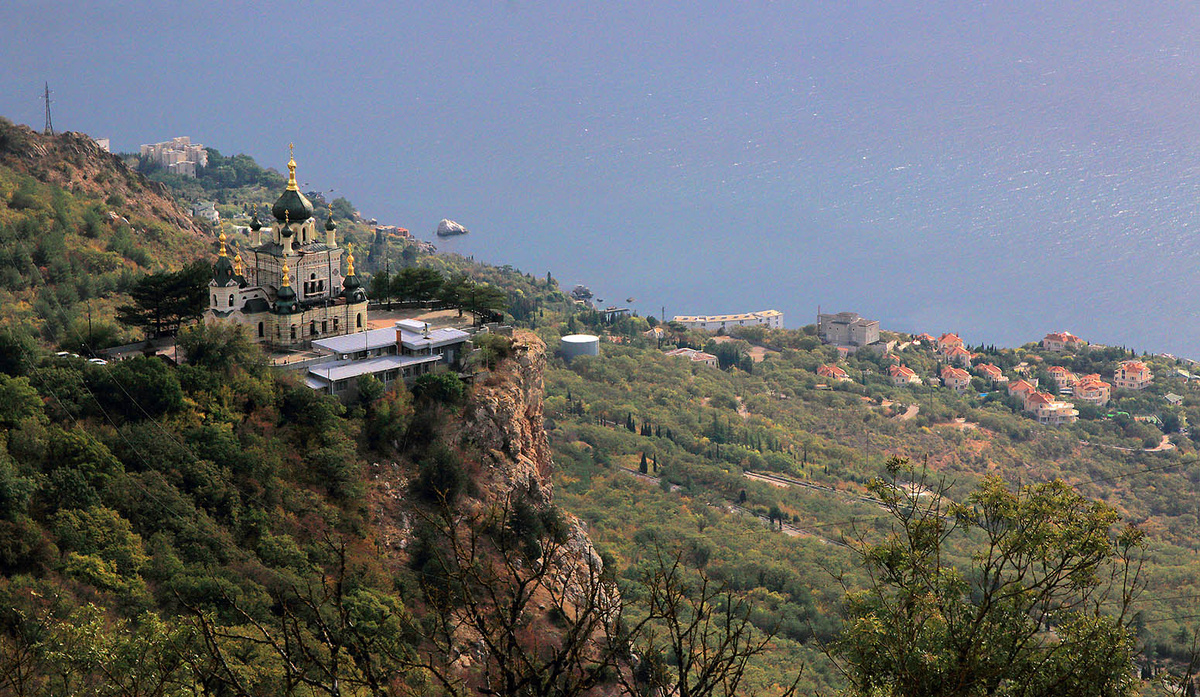 Следующий день был отдан западному направлению, т.е. поездке на перевал Байдарские ворота и в Форос. Утром мы заказали такси, Погода снова была почти солнечной. Снимать я начал у Форосской церкви. О ней снова из интернета - "На живописном южном склоне Крымских гор, выше Фороса, на отвесной скале высотой 400 м над уровнем моря возвышается одна из самых узнаваемых достопримечательностей полуострова — Церковь Воскресения Христова, которая была возведена в память о чудесном спасении Александра III. Сегодня Форосская церковь является архитектурным памятником, духовным и историческим символом Крыма, притягивающим много паломников и туристов со всего мира. Архитектурный замысел сочетает черты старорусского храмового зодчества с элементами византийского стиля. Благодаря этому Форосская церковь выглядит одновременно строго и торжественно. Главная особенность – расположение на краю Красной скалы, поэтому создаётся впечатление, будто церковь парит над облаками. Этот визуальный эффект усиливают