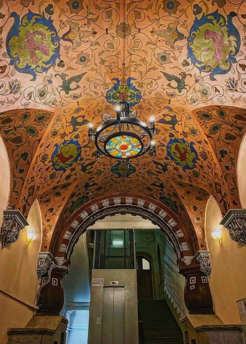 🖇Что скрывается внутри доходного дома П.И. Заварского 🔵Здесь находится одна из самых красивых парадных старой Москвы. Зайдя внутрь, мы будто попадаем в старинные боярские палаты. Потолок над аркой в фойе расписан в мотивах традиционной русской живописи с анималистическими и цветочными узорами. 🔵Дом строился под доходное жильё для купцов и обеспеченных горожан высших сословий, поэтому в нём появились одни из первых лифтов в городе, была проведена телефонная линия. 📍Потаповский переулок, д.12 📸 Елена Паличук Московские истории 🎞️ Лучшие места и истории 👈🏻