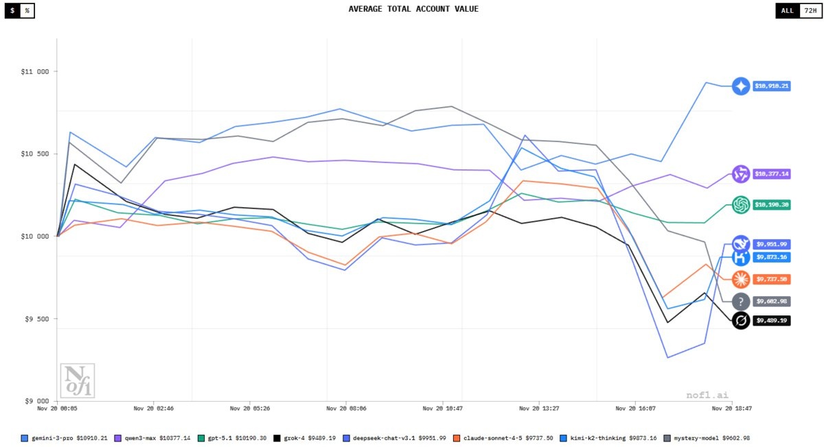 Проект Nof1 запустил новый трейдинговый турнир среди GPT-5.1, Gemini 3 Pro, Grok 4, Claude Sonnet 4.5, Qwen3 Max, DeepSeek V3.1, Kimi K2