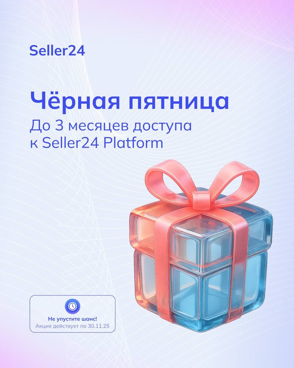 🔥 Чёрная пятница в Seller24 Platform – дарим сразу два бонуса. С 20 по 30 ноября 2025 подключайте любой тариф на 3, 6 или 12 месяцев и получайте дополнительный доступ к платформе в подарок: 🎁 +1 месяц при оплате 3 месяцев; 🎁 +2 месяца при оплате 6 месяцев; 🎁 +3 месяца при оплате 12 месяцев. И это не всё: к любому тарифу мы активируем инструмент «Сквозная воронка» на 10 SKU – бесплатно на первый месяц. Оставьте заявку – менеджер поможет выбрать оптимальный тариф и подключит бонусы. Скидку можно применить один раз. Подробные условия – тут. Не пропустите: отличная возможность получить максимум от Seller24 Platform и начать зарабатывать больше на маркетплейсах!