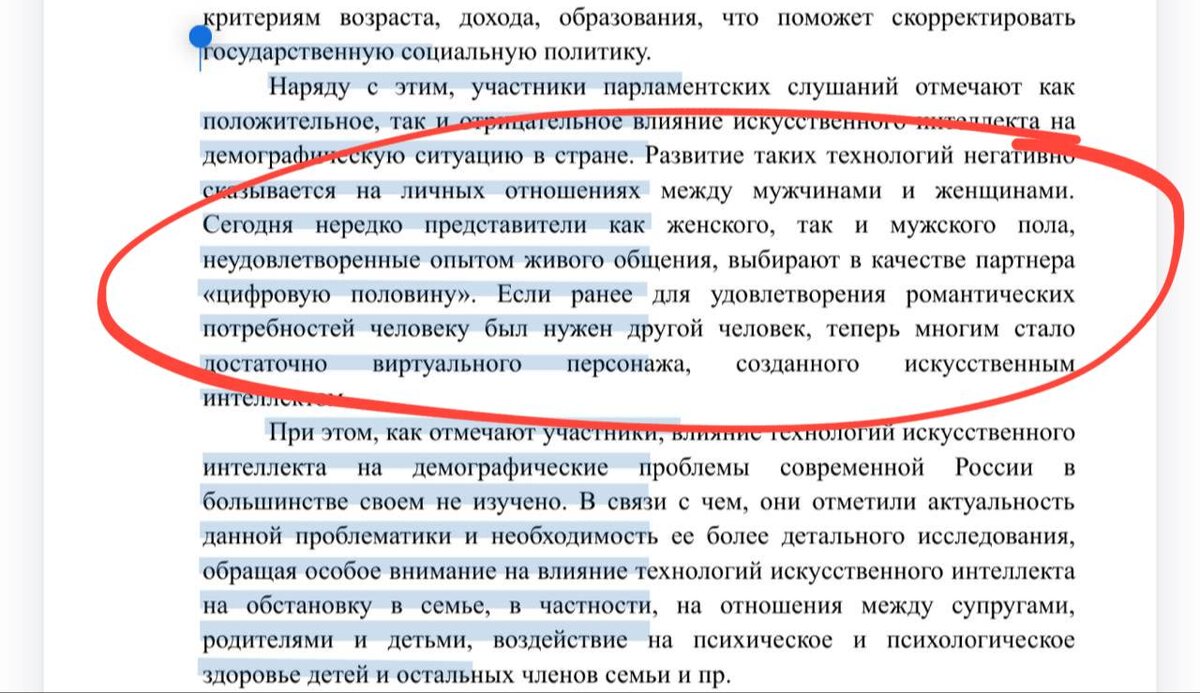 Девочки, найдена найдена РЕАЛЬНАЯ угроза демографии России. Это искусственный интеллект. Который ссорит мужчин и женщин России и не дает им размножаться. Сегодня прошли парламентские слушания «Демографические вызовы и искусственный интеллект». По совету читателя, изучили документы к нему. Много удивлялись. РАН поручено, например, «провести исследование влияния технологии ИИ на обстановку в семье, в частности, на отношения между супругами, родителями и детьми, воздействие на психическое и психологическое здоровье детей и остальных членов семьи и пр». Всего, на прорывные исследования в сфере искусственного интеллекта будет направлено 3,5 млрд. рублей 2026 г., в 2027 2,7 млрл.руб., в 2028 2,8 млрд.руб.