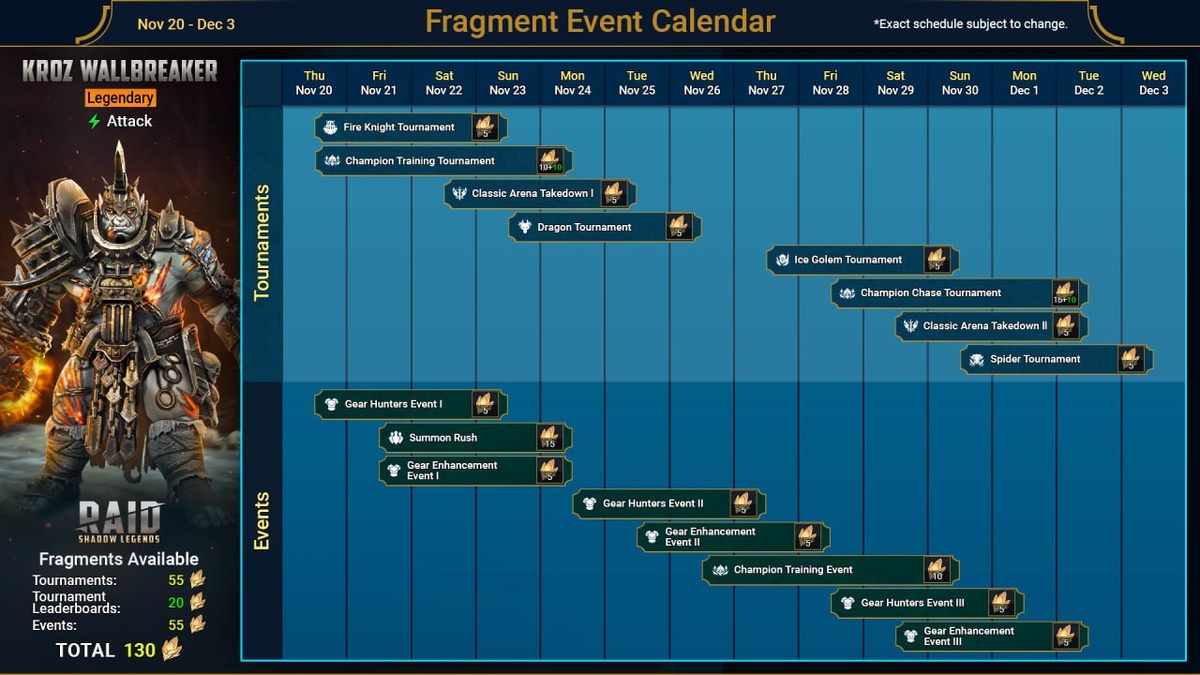 Расписание слияния на Кроза Крушителя — СОБЫТИЯ - Массовый призыв (21-24 ноября) - Тренировка героев (26-30 ноября) - Поход за снаряжением I (20-23 ноября) - Поход за снаряжением II (24-27 ноября) - Поход за снаряжением III (28 ноября - 1 декабря) - Улучшение снаряжения I (21-24 ноября) - Улучшение снаряжения II (25-28 ноября) - Улучшение снаряжения III (29 ноября - 2 декабря) — ТУРНИРЫ - Турнир пополнения коллекции (28 ноября - 2 декабря) - Турнир тренировки героев (20-24 ноября) - Турнир Дракона (23-26 ноября) - Турнир Ледяного голема (27-30 ноября) - Турнир Лавового рыцаря (20-23 ноября) - Турнир Паучихи (30 ноября - 3 декабря) - Баталии на Арене I (22-25 ноября) - Баталии на Арене II (29 ноября - 2 декабря)