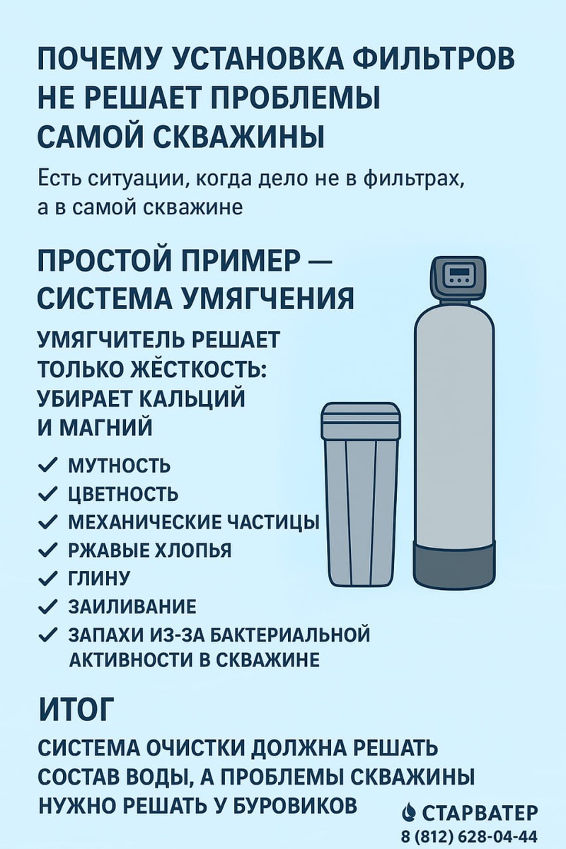 💧 Почему установка фильтров не решает проблемы самой скважины Многие думают, что если поставить хорошую систему очистки — вода автоматически станет идеальной. Но не всё так просто. Есть ситуации, когда дело не в фильтрах, а в самой скважине. И никакая система очистки не сможет исправить то, что связано с конструкцией, нарушениями бурения или заиливанием. 🔹 Простой пример — система умягчения Умягчитель решает только жёсткость: убирает кальций и магний. Но он не убирает: – мутность; – цветность; – механические частицы; – ржавые хлопья; – глину; – заиливание; – запахи из-за бактериальной активности в скважине. Если вода идёт жёлтая, мутная или с песком, то проблема обычно не в фильтрах. Это может быть: – разрушенный фильтр колонны скважины; – неправильная обсадка; – нарушение герметичности стыков; – попадание верховодки; – заиливание водоносного горизонта; – “подсос” поверхностной воды. В таких случаях установка системы очистки — это борьба со следствием, а не с причиной. 🔹 Что