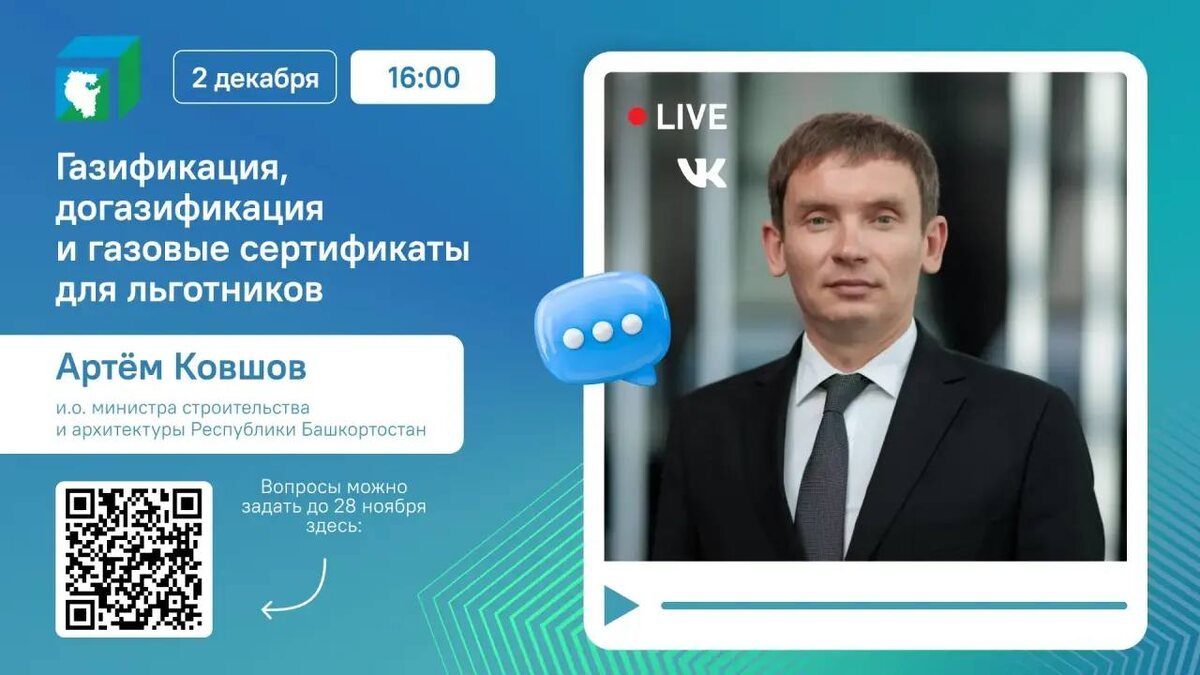 Все, что нужно знать о газификации, догазификации и газовых сертификатах для льготников – в прямом эфире из ЦУР Башкортостана 2 декабря в 16:00 На вопросы жителей ответит Артём Ковшов, и.о. министра строительства и архитектуры Республики Башкортостан. Сбор вопросов на Платформе обратной связи «Госуслуги. Решаем вместе» до 29 ноября по ссылке: https://vk.cc/cRul5N