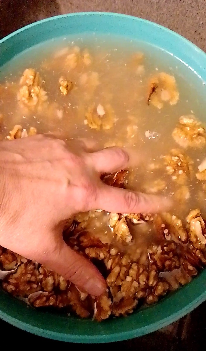 Есть научные статьи по поводу вымачивания или замачивания орехов. В них там фитиновая кислота содержится и она мешает усвоению каких-то других веществ. В то же время есть лекарство фитиновая кислота. Поэтому не знаю так ли она вредна нам. Однако, я попробовала один раз орехи вымочить. Залила водой и офигела от мусора и цвета воды после мытья. Понятное дело, что цвет даёт оболочка орехов, но грязи там тоже предостаточно. В воде держу часа 3-4, в этот раз на ночь остались. Воду 2-3 раза меняю. И получаются орехи вот такие беленькие По вкусу мне нравятся прям мокрые. Они нежные, я думаю, как молодые орехи из скорлупы. Но поскольку мокрые орехи храниться не будут, заплесневеют, то я их сушу в духовке. Орехи, конечно, потемнеют и сожмутся, но по вкусу они будут отличаться от первоначальных. Меньше горечи. Я так вымачивала и миндаль и лесной орех. Но чаще всего грецкий покупаю. Нам больше нравится