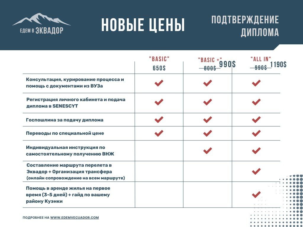 📢 Важно! С 1 декабря обновление цен на ПОДТВЕРЖДЕНИЕ ДИПЛОМА Друзья, заранее предупреждаю: с 1 декабря меняются цены на два пакета. Но у вас ещё есть время — до 1 декабря можно заключить договор по старой стоимости. ------------------------------------------------------ ❗Цены на подтверждение диплома, которые НЕ изменятся: ✅ “Basic” — 650$ ------------------------------------------------------ ❗Цены на подтверждение диплома, которые вырастут с 1 декабря: 🔺 “Basic+” — будет 990$ (сейчас 800$). В этот пакет, помимо подтверждения диплома входит инструкция и консультация по ВНЖ. 🔺 “All In” — будет 1190$ (сейчас 990$). В этот пакет, помимо подтверждения диплома входит инструкция и консультация по ВНЖ, а так же сопровождение перелета, помощь с покупкой билета, организация трансфера из гид по Куэнке. ------------------------------------------------------ Отдельная услуга: 🔹 Индивидуальная инструкция и разовая консультация по самостоятельному получению ВНЖ — 400$ (с 1 декабря,