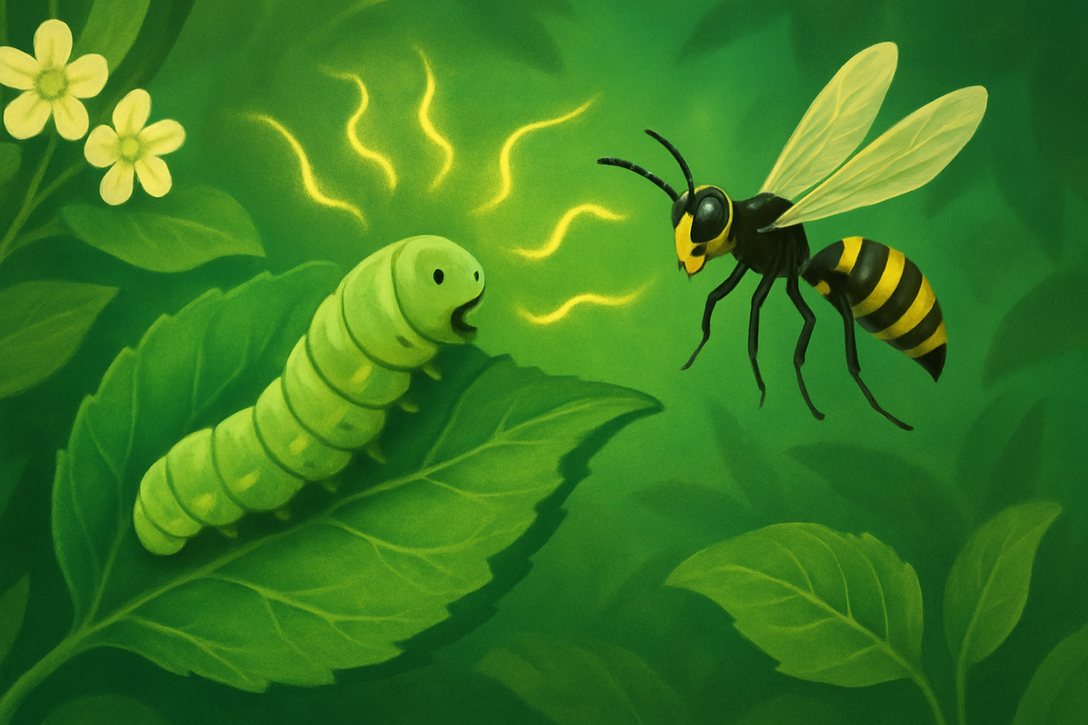 Это те самые запахи, которые мы чувствуем, когда: Но для растений этот запах — крик о помощи. 🐛 → 🦟 Самое невероятное начинается дальше. GLV распространяется по воздуху и привлекает… врагов тех, кто ест растение. Гусеница жуёт лист → растение выпускает GLV → на запах прилетают паразитические осы. Эти осы находят гусеницу и откладывают в неё свои яйца.