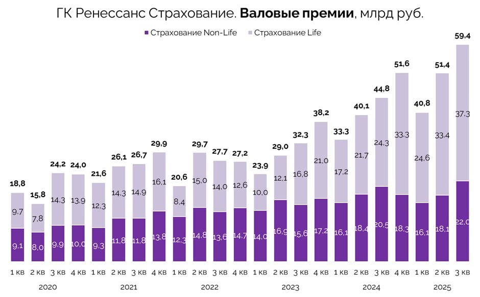 🏦 Ренессанс Страхование. Когда ставка и друг, и враг. Коротко пробежимся по отчету за III кв. 2025 г. — Премии в сегменте Non-life страхования ускорились до 7% г/г — до 22 млрд руб. В сегменте Life рост на 33% г/г — до 37,3 млрд руб. — Страховой портфель прибавил с начала года 17,2% и составил 275 млрд руб. Чистая прибыль за 9 мес. 2025 г. составила 6,7 млрд руб. (-24% г/г). Умеренная скорость снижения ключевой ставки оказывает двойственное влияние на бизнес: — сохраняется давление на бизнес Non-life на фоне сокращения общего спроса; — более длинный период высокой ключевой ставки позволяет получать хороший инвестиционный доход и поддерживать высокие продажи продуктов накопительного страхования. Пока думается, что в секторе есть истории привлекательнее 💬 Telegram | 📺YouTube|💰Private-чат