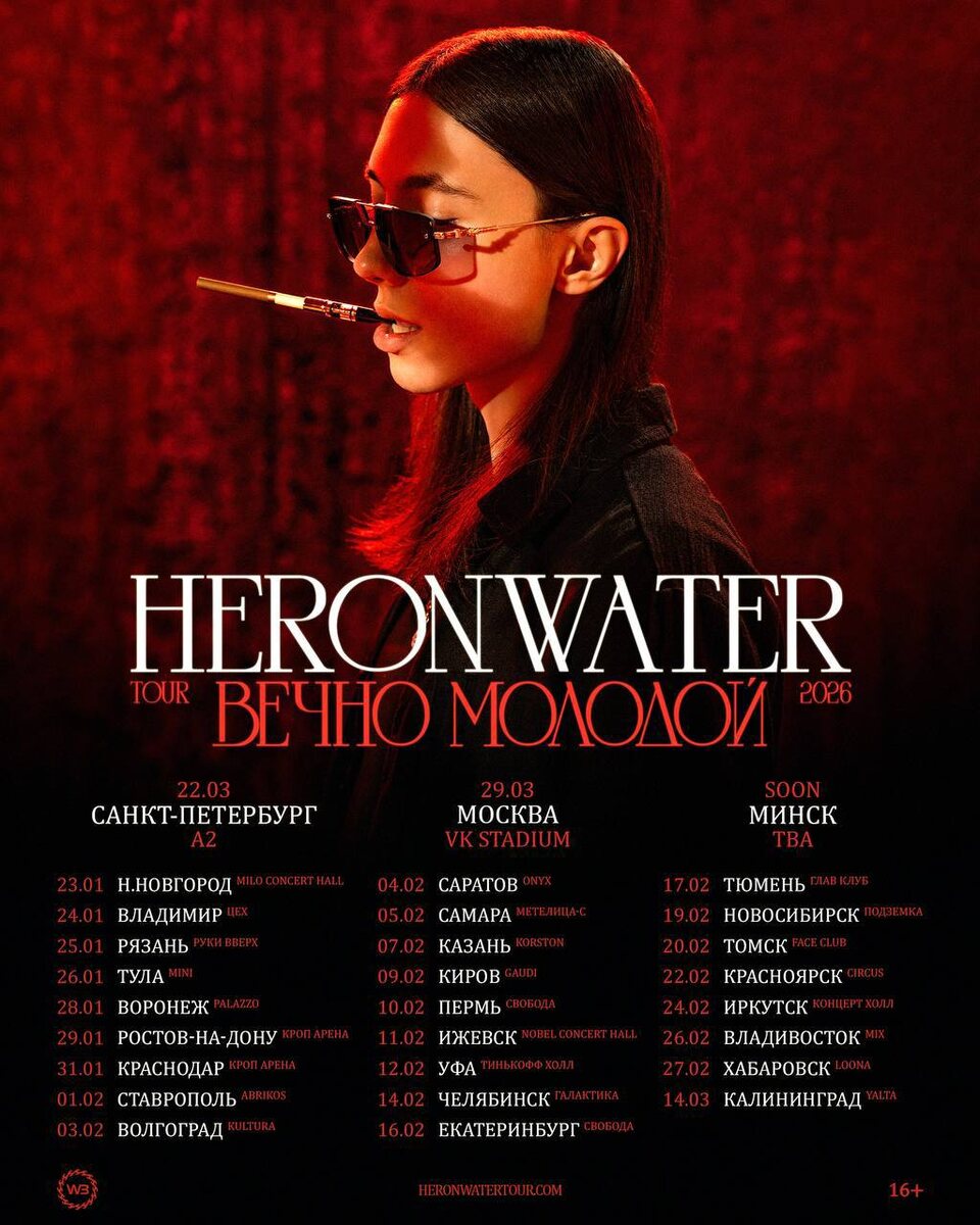 🎫 – Heronwater: тур «Вечно Молодой» в 2026 году 🎤 – Heronwater 📍 – 29 городов: Нижний Новгород, Владимир, Рязань, Тула, Воронеж, Ростов-на-Дону, Краснодар, Ставрополь, Волгоград, Саратов, Самара, Казань, Киров, Пермь, Ижевск, Уфа, Челябинск, Екатеринбург, Тюмень, Новосибирск, Томск, Красноярск, Иркутск, Владивосток, Хабаровск, Калининград, Москва, Санкт-Петербург, Минск 🗓 – 23 января 2026 – 29 марта 2026 (Минск — будет анонсирован позже) 💵 – от 1 500 руб. 🔗 – билеты (16+) #концерты #билетынаконцерт #heronwater #вечномолодой #нижнийновгород #владимир #рязань #тула #воронеж #ростовнадону #краснодар #ставрополь #волгоград #саратов #самара #казань #киров #пермь #ижевск #уфа #челябинск #екатеринбург #тюмень #новосибирск #томск #красноярск #иркутск #владивосток #хабаровск #калининград #москва #санктпетербург #минск 👉 Список концертов: ноябрь • декабрь @mainstreamusic