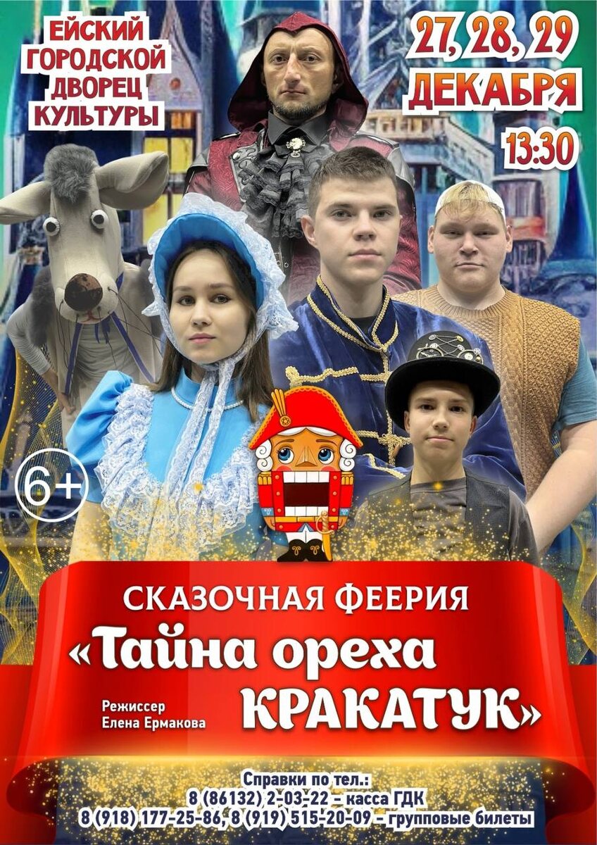 Начни новогодние каникулы с волшебной сказкой в Ейском городском дворце культуры ❄️ 27, 28 и 29 декабря в 13:30 сказочная феерия «Тайна ореха кракатук», режиссёр Елена Ермакова Билеты можно приобрести в кассе по адресу: ул. Свердлова, 73/1, а также онлайн Цена: от 400₽ Справки по тел.: касса — 8 (86132) 2-03-22. Режим работы: с 11:00 до 18:00. 8 (918) 177-25-86, 8 (919) 515-20-09 — групповые билеты Юная Маша попадает в Волшебную страну, где её любимые игрушки – медведь, Буратино и Щелкунчик – оживают и становятся настоящими друзьями. Вместе они сталкиваются с могущественным Крысиным Королем, жаждущим завладеть волшебным орехом и поработить весь мир. На кону – дружба, преданность и готовность пожертвовать самым дорогим ради тех, кого любишь. 🚀 Подписывайтесь: @gdk_ejsk