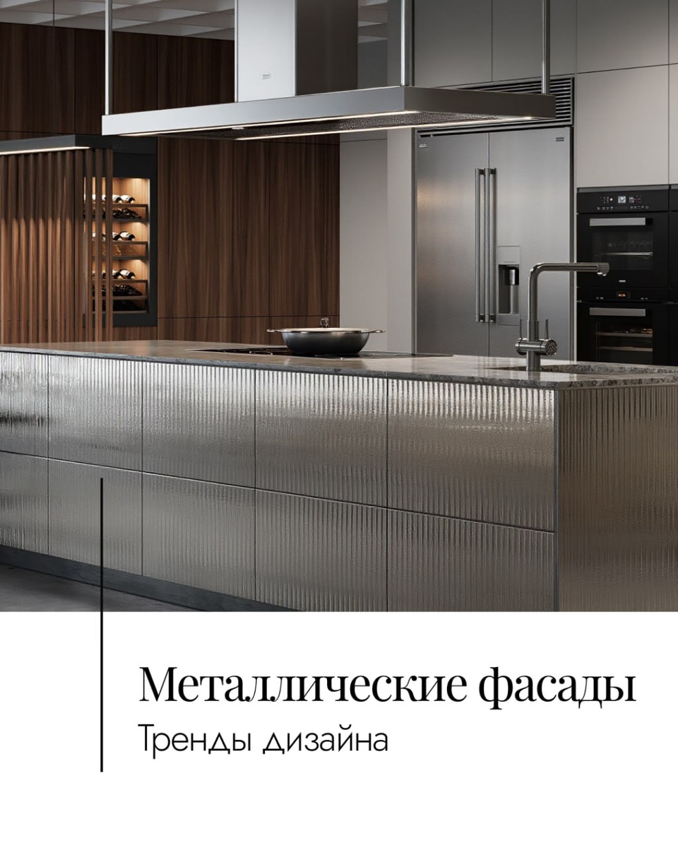 Металлические фасады — тренд, который уверенно держится на пике популярности уже несколько лет. Холодный блеск стали, тепло меди или латуни создают в интерьере смелый и абсолютно незабываемый характер. Секрет металла кроется в его универсальности. Он идеально дополняет бетон, кирпич, дерево и камень. При этом не обязательно идти на все сразу: акцентной панели, фартука или столешницы из металла будет достаточно, чтобы преобразить кухню. А вы готовы воплотить такую идею в своем проекте? 😎