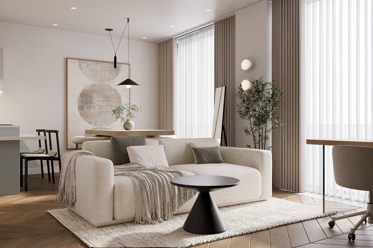 ВИЗУАЛИЗАЦИИ. 📍 ЖК Симфония 34/3 Часть - 1. 🖋️ Первый вариант прихожей, кухни-гостиной и санузла на этом объекте, долго думали, как нам завязать современный минимализм, джапанди и цветную кухню с цветным санузлом, чтобы пространство выглядело светлым и уютным, а рабочая зона не выглядела перегруженной. 🙏 Считаем, что с задачей справились! Первоначально, заказчикам понравилась наша идея, но мы ждем финального ответа 🥰 ❗Ранее делали разбор планировок тут и показывали финальный вариант, который ушел в работу. 🤓 А как вам, нравится результат?