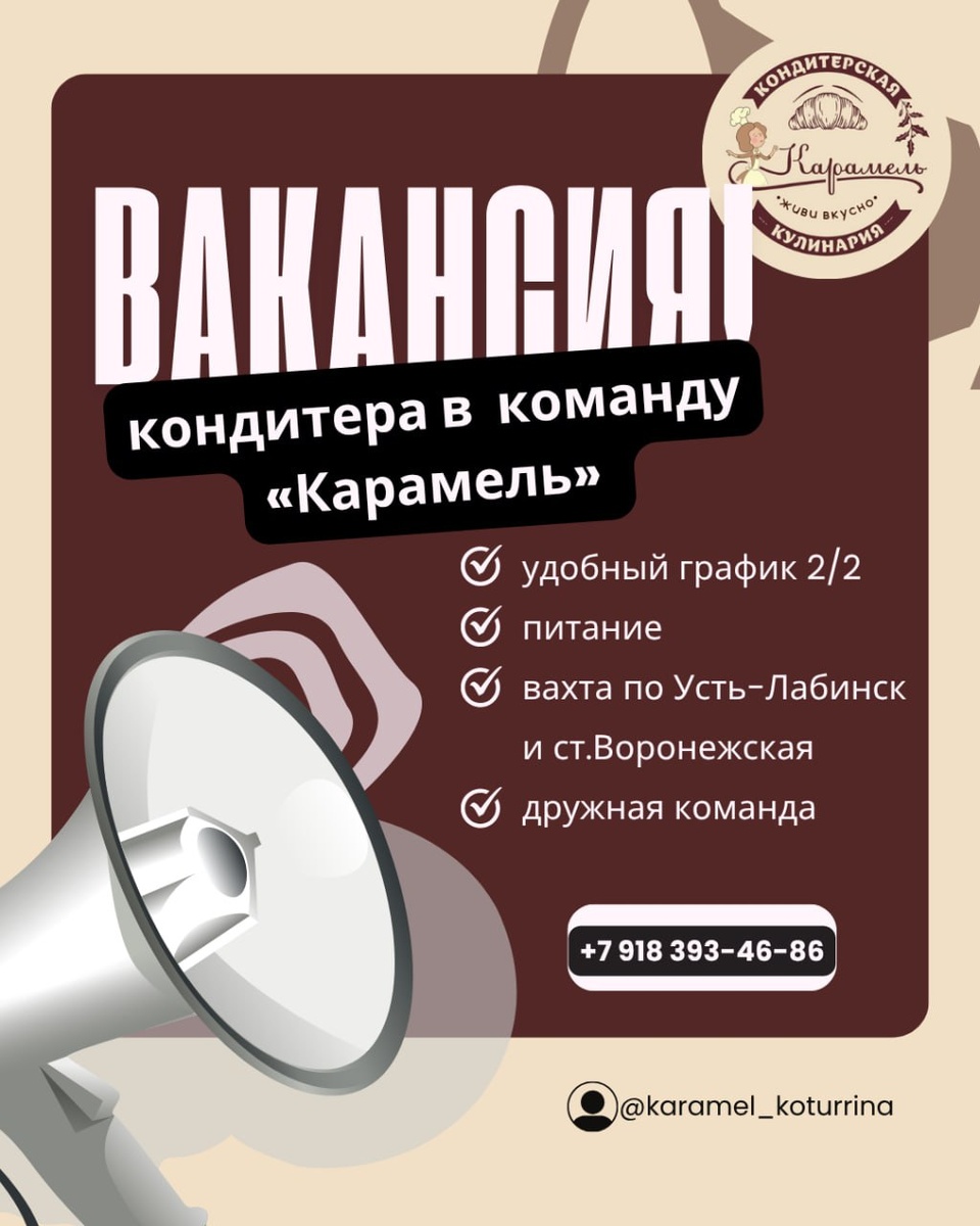 ❗️ Ищем кондитера в нашу сладкую команду «Карамель» 💗 Любишь создавать торты, пирожные и настоящие сладкие шедевры? Тогда тебе точно к нам! ✨ В сети кондитерских «Карамель» @karamel_koturrina открыта вакансия кондитера — ищем человека с любовью к делу и аккуратными руками 🧁 Мы предлагаем: ✅ удобный график 2/2 ✅ вкусное питание за счёт компании 🍲 ✅ вахта по направлениям Усть-Лабинск и Воронежская 🚐 ✅ дружную команду и уютную атмосферу 🤍 Если хочешь работать там, где пахнет ванилью, шоколадом и хорошим настроением — ждём тебя! 🍫✨ 📞 Все вопросы по телефону: +7 918 393-46-86 #кондитер #работавкондитерской #вакансия #работадлятворческих #сладкаяработа #кондитерскаякарамель #работаумечты #устьлабинск #воронежская #вахта #график2на2
