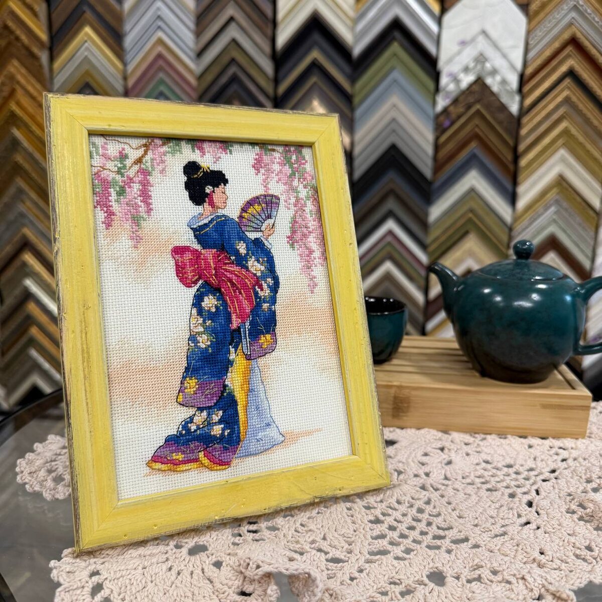 Не только свитерами богаты 🥅— особенное внимание мы уделяем вышивкам. 🎨 Например, вот эта гейша, стоящая под сакурой. С веером в руках она внимательно смотрит на мой чайник с зеленым чаем 🍵 и наверняка хочет отпить... Обратите внимание на рамочку: желтенький итальянский багет — брашированный, поблекший, состаренный ✨. Почти все вышивки — это коллективный труд, где сама вышивальщица часто выступает главным дирижёром и идейным вдохновителем, а ваш скромный слуга — лишь ассистент 😅. И это понятно: вышивка — трудоёмкий и чертовски кропотливый процесс 🧵✨. С опытом мы научились смотреть «глазами заказчика» 👀 и понимаем с полуслова. Не уверены в выборе — мы всегда рядом с идеями и вариантами оформления 🖌️ Точно знаете, что нужно — не вопрос ✅ Приносите свои очаровательные вышивки 🧵, и к каждой подберём оформление, уделив максимум внимания ✨. Ну и конечно, мы не ищем стандартных решений — к нам приходят за эксклюзивом, который часто рождается в простоте ✨. ✨ Арт-мастерская Багетъ — в