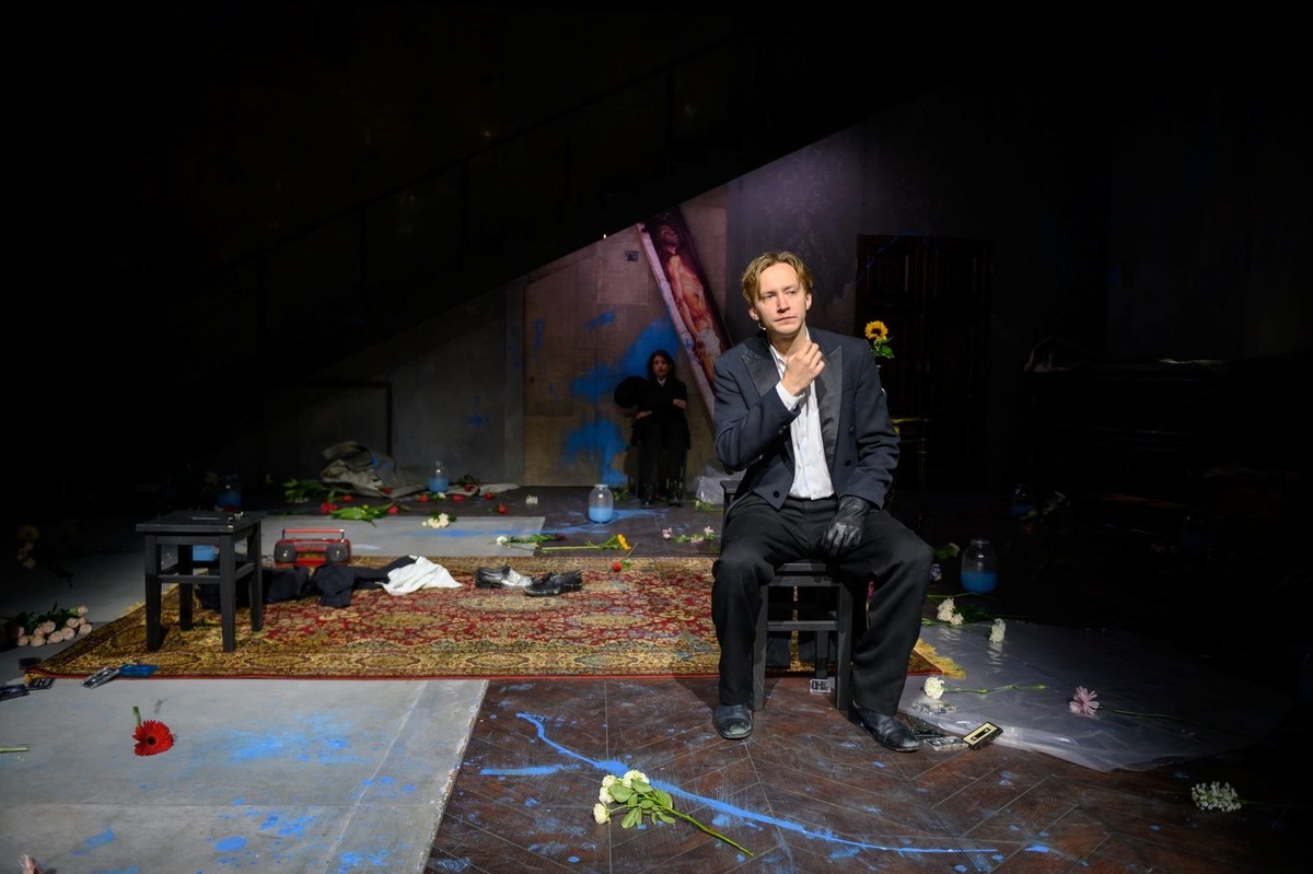 Зрители, входящие в зал, видят пространство, на котором трагедия уже свершилась. Четверо героев – Мышкин, Рогожин, Настасья Филипповна и Аглая – молчаливы, морально и физически истощены, неподвижно наблюдают со сцены, как заполняются ряды. Вокруг них – вылитое место преступления: мусор, разбросанные цветы, банки с голубой жидкостью. Стены тоже вымазаны голубой, липкой и тягучей краской. В ней же испачкан огромный тесак в руках Рогожина (Данил Стеклов). Нет сомнений, что это условная, но оттого не менее жуткая кровь. Настасья Филипповна (Аня Чиповская), хоть и сидит у стены, уже мертва, — её колени накрыты клеенкой. К лестнице приставлено «Тело мертвого Христа» Ганса Гольбейна Младшего – та самая картина, что в романе висела над дверью в доме Рогожина. Именно это полотно, однажды так потрясшее Достоевского («у иного вера может пропасть»), становится ключом к пониманию спектакля. Следуя за ним, Волков показывает, что происходит с людьми, когда они сталкиваются со смертью ума, смертью без воскресения. Гольбейновский Христос, здесь расположенный не горизонтально или вертикально, а под углом – символ распятой, не воскресшей надежды – дает новый ракурс на классику, становясь молчаливым свидетелем и полноправным участником действия.