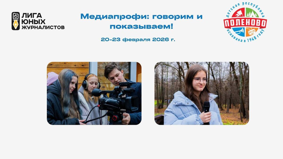 Вы этого ждали! Новая смена “Медиапрофи: говорим и показываем!” Погружаемся в медиатворчество! 🚀 Привет, юный журналист и будущая звезда телеэкрана! Готов научиться создавать яркий медиаконтент? ✨ 📆С 20 по 23 февраля 2026 года в Детской Республике «Поленово» вновь стартует программа «Медиапрофи: говорим и показываем!» от Лиги юных журналистов. Это твой шанс обучиться новым профессиям и создать собственный проект! Что ждёт в программе? 🎬Освоим популярные медиапрофессии: стань корреспондентом, оператором, ведущим, монтажёром, SMM-специалистом или фотографом. 🎤Снимем яркие материалы: от идеи до готового сюжета в эфире! 📸Создадим ТВ-проекты и фоторепортажи: которые увидят тысячи людей. 🔴Попробуем силы в прямом эфире: почувствуй драйв и адреналин настоящего телевидения! ▶️Познакомимся с профессиональной техникой: камеры, микрофоны, свет — всё по-взрослому. ⚡Научимся журналистским секретам: как брать интервью, работать в кадре и писать цепляющие тексты. И это ещё не всё! Нас ждут