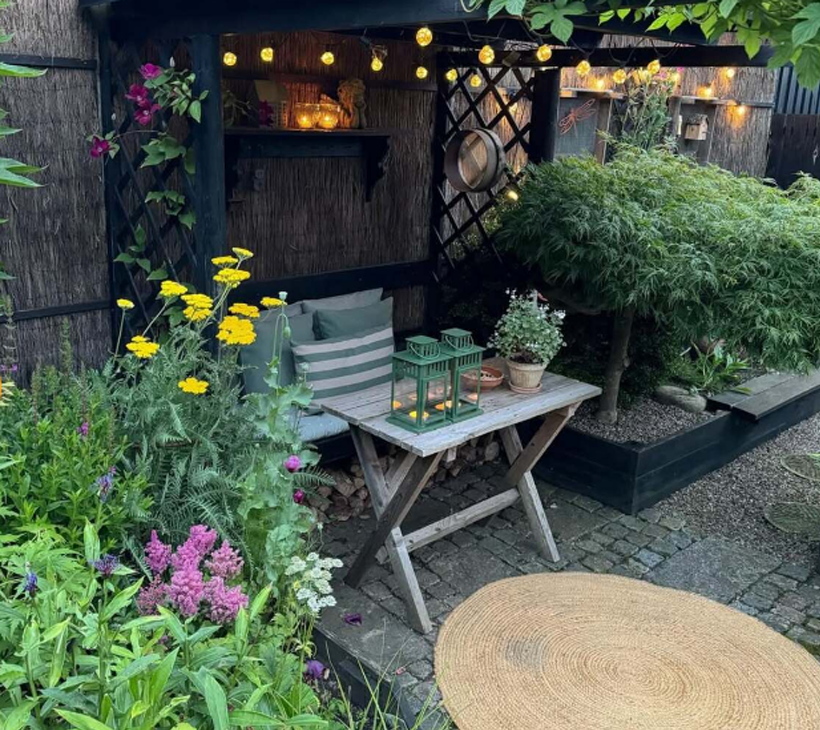 Ворота состоят из перголы, покрытой металлическими листами, которые служат навесом, и решетчатых бортиков, поддерживающих виноградные лозы. Гирлянды, фонари и свечи, работающие на солнечных батареях, создают уют в садовом уголке и делают его комфортным для более длительного пребывания на свежем воздухе.