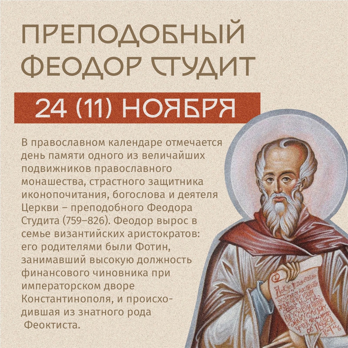 24 (11) ноября православные вспоминают одного из величайших подвижников монашества, страстного защитника иконопочитания, богослова и деятеля Церкви – преподобного Феодора Студита (759–826). Он разработал богослужебный Студийский устав и вошел в историю Византии благодаря защите идеалов нравственности и духовности, что отразилось в неприятии им второго брака императора Константина VI в 795 г. Также выступал против иконоборчества в правление Льва V Армянина (813–820). Подробнее о преподобном Феодоре Студите рассказали в карточках: