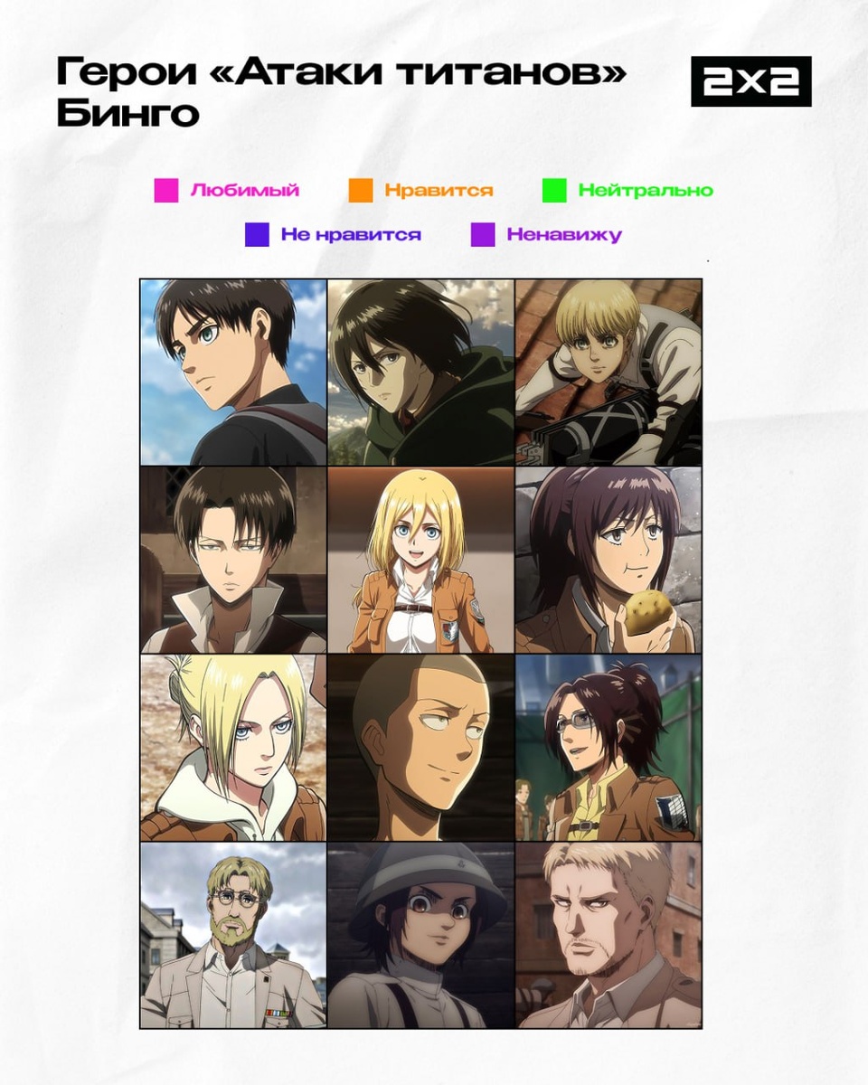 Кто в топе зрительских симпатий, а кого не жаль отдать на растерзание титану? Выясняем с помощью ваших бинго — выделяйте героев цветом и показывайте в комментах