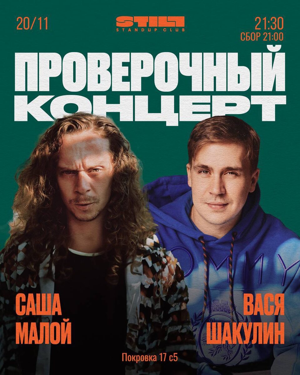 Напоминаем про концерты на этой неделе в московском Still StandUp Club: ✔️Саша Малой и Вася Шакулин. Проверка материала — сегодня, 20 ноября, начало в 21.30 🎫 Билеты 1000-2000₽ ✔️Лёша Шамутило. Проверка материала — послезавтра, 22 ноября, начало в 21.30 🎫 Билеты 1000-1800₽ 📆 18-22 ноября, в 21:30 📍 Still StandUp Club, Москва, ул. Покровка, 17, стр. 5, м.Чистые пруды