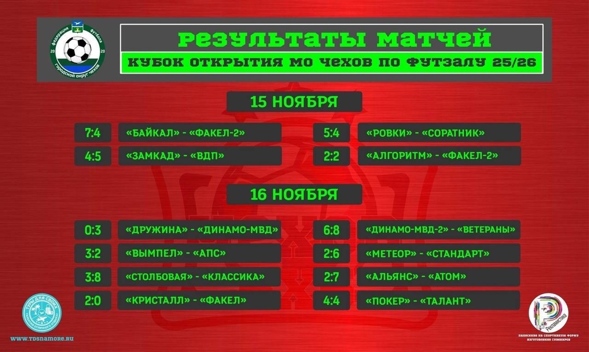 ✨ Наши новости! ⚽️ ЧЕМПИОНАТ МО ЧЕХОВ ПО ФУТЗАЛУ 25-26🏆 ☀️ Результаты матчей Чемпионата муниципального округа Чехов по футзалу сезона 2025/2026, которые прошли 15 и 16 ноября на малой спортивной арене дворца спорта «Олимпийский» им. В.С. Максимова» 📝 Продолжайте следить за новостями!😉⚽️ Организаторы турнира: Федерация футбола муниципального округа Чехов 🏢 Дворец спорта Олимпийский имени В.С. Максимова 📍 г. Чехов, ул. Полиграфистов, стр.30 ⭐Разместить публикацию ⭐Поддержать голосом ✅ Спортивный Чехов https://dzen.ru/id/66f02564335c7475d84fbf87 http://vk.com/chehov_sport http://dzen.ru/chehov_sport