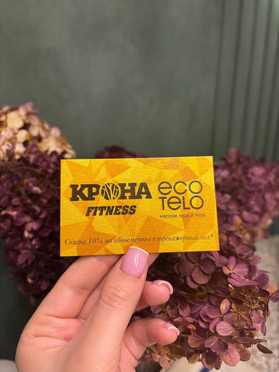 ♥️ ECO TELO & КРОНА FITNESS — объединяем заботу о теле в одну мощную систему! Мы запускаем совместную акцию, которая делает ваш путь к здоровью и комфорту ещё приятнее. При покупке абонемента от 3 месяцев в КРОНА FITNESS вы получаете особый подарок — скидку 10% на все услуги ECO TELO. Это возможность попробовать массажи, спа-программы, уходы за лицом и полностью перезагрузиться в атмосфере заботы. А ещё мы подготовили дополнительный бонус для наших гостей: при покупке от 5 сеансов массажа в ECO TELO вы получите купон на скидку 10% в КРОНА FITNESS. Это идеальная связка для тех, кто выбирает регулярный уход, стабильность и качественный результат. Заботьтесь о себе красиво — мы уже всё продумали. 🕊 Срок действия предложения — до 31 декабря 2025 года.